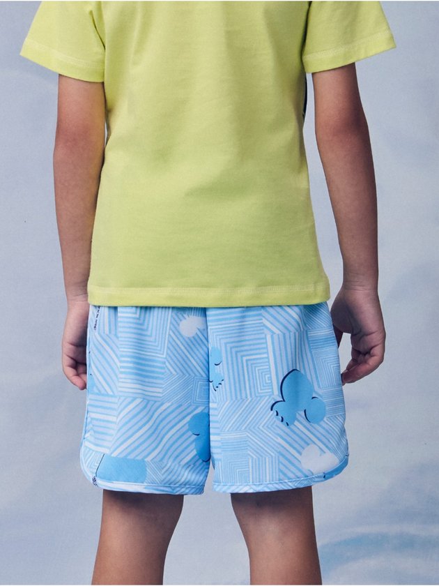 Bermuda azul vibrante com estampa geométrica em tons claros, criando um efeito visual moderno e descolado. Modelagem confortável e fresca, perfeita para acompanhar os pequenos em aventuras ao ar livre com muito estilo.