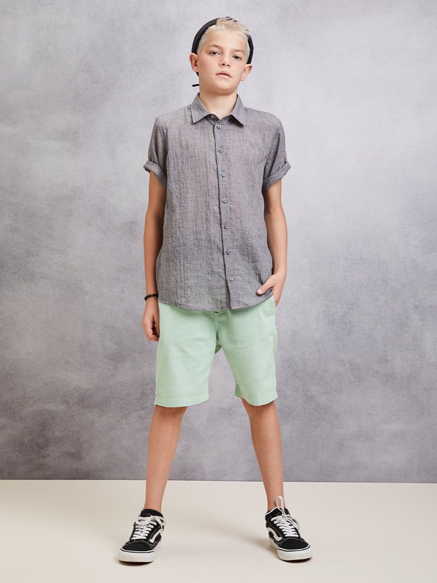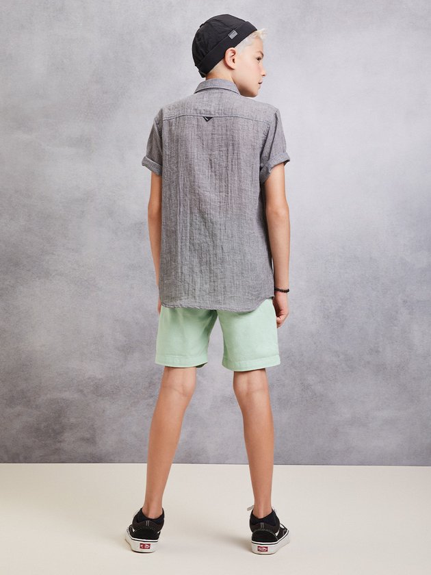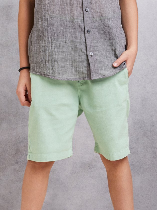 Bermuda verde claro com bolsos frontais e traseiros, uma peça leve e prática para dias ensolarados. O modelo traz um ar de frescor e combina perfeitamente com camisetas estampadas ou lisas, para um visual despojado e cheio de estilo.