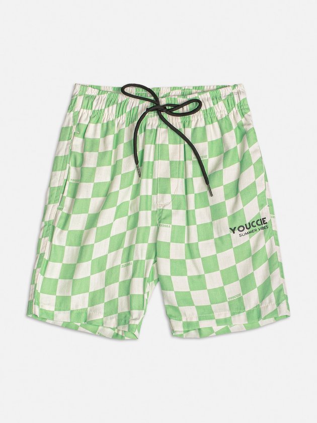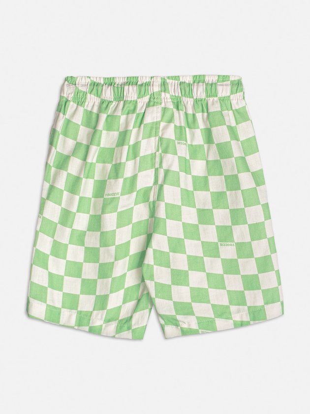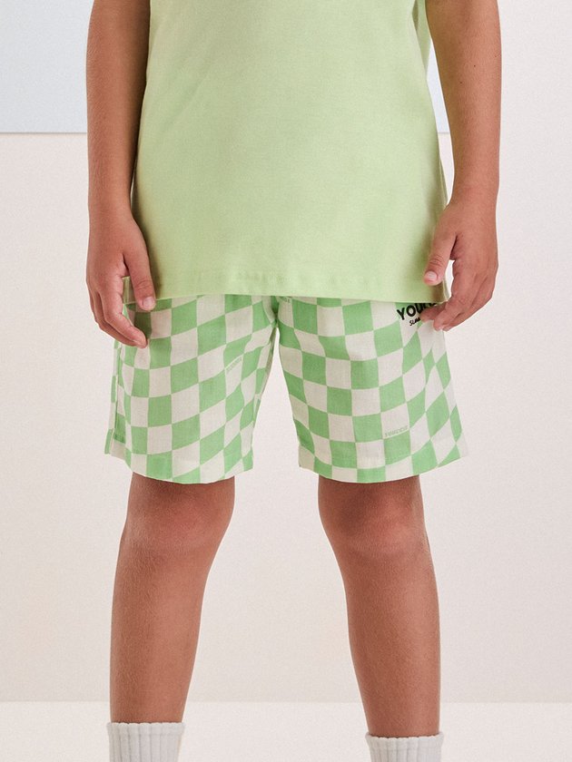 Destaque-se no verão com esta bermuda quadriculada verde e branca. Com um design moderno e ousado, é perfeita para meninos que gostam de se expressar através do estilo. O cadarço preto na cintura adiciona um toque de contraste, completando o visual descolado.