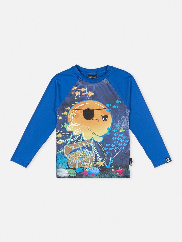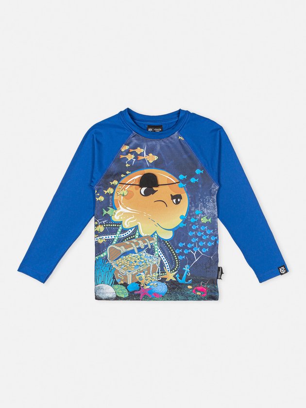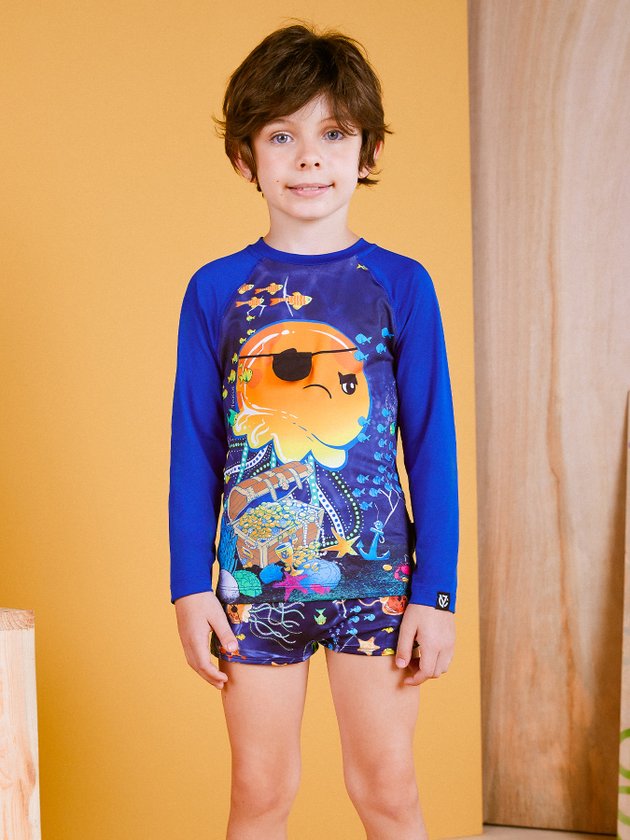 Vamos curtir o verão na praia! Camiseta em manga longa com proteção UV e estampa do fundo do mar que é a cara do verão. A peça conta com decote com gola redonda, estampa frente e lateral com etiqueta decorativa. Composição: 90% poliéster e 10% elastano. Ref.: I0804