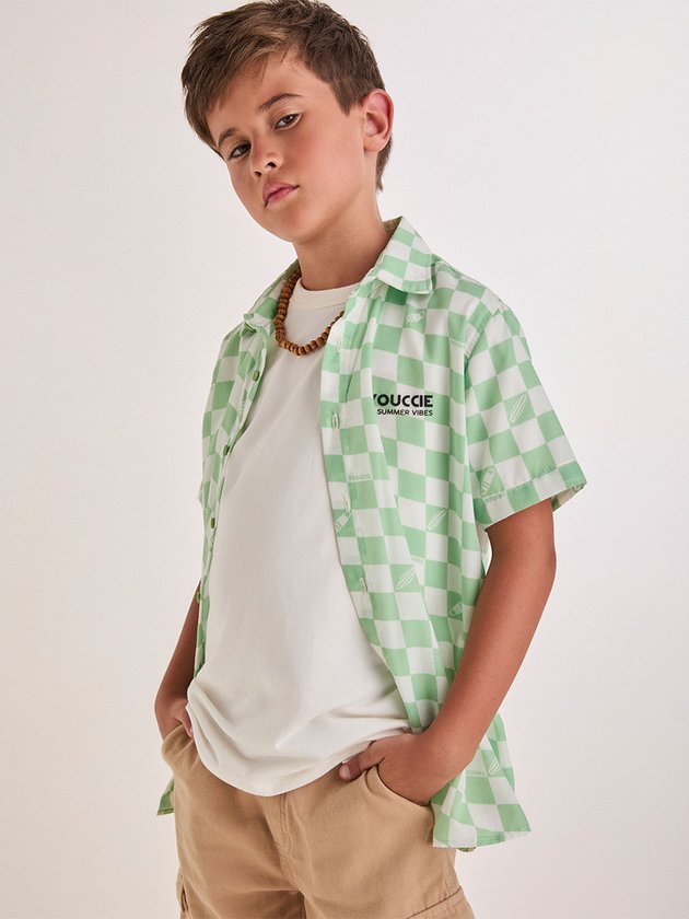 Destaque-se neste verão com a camisa xadrez verde e branca. Com uma estampa vibrante e divertida, ela traz uma energia leve e descontraída para o visual dos meninos. Feita em tecido fresco e confortável, é perfeita para os dias quentes, garantindo estilo e conforto em qualquer aventura ao ar livre.