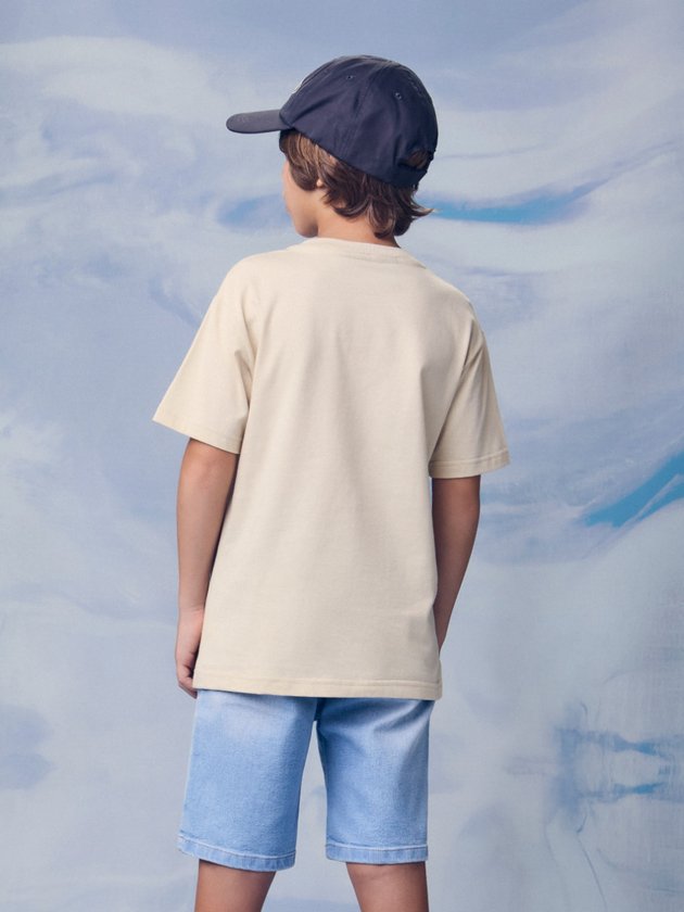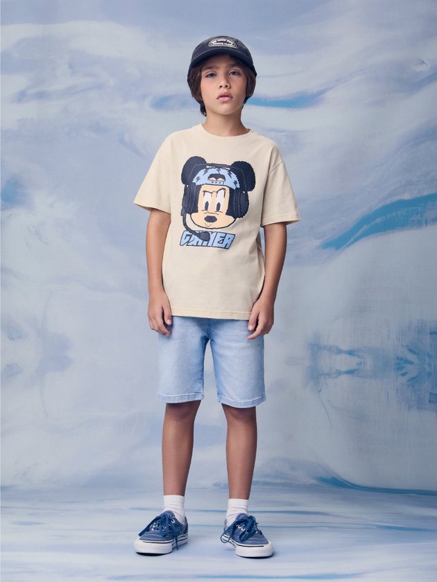A camiseta bege traz a estampa exclusiva do Mickey Gamer, com efeito de brilho sutil que adiciona um toque moderno e diferenciado. O decote em ribana proporciona ajuste confortável, enquanto a malha 100% algodão oferece frescor e maciez. Peça licenciada Disney, indispensável para os meninos que amam estilo e personalidade.
