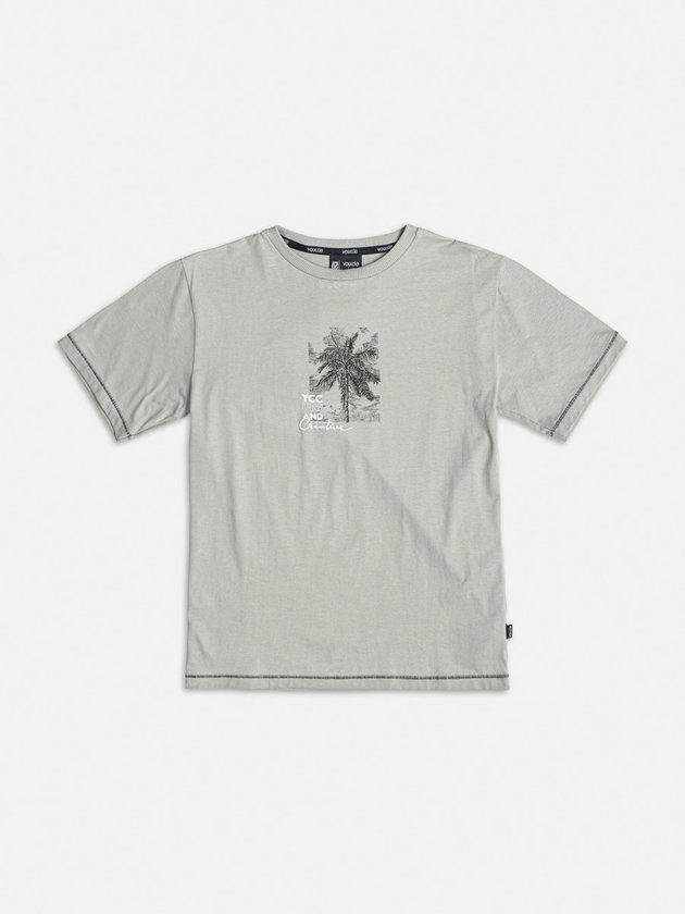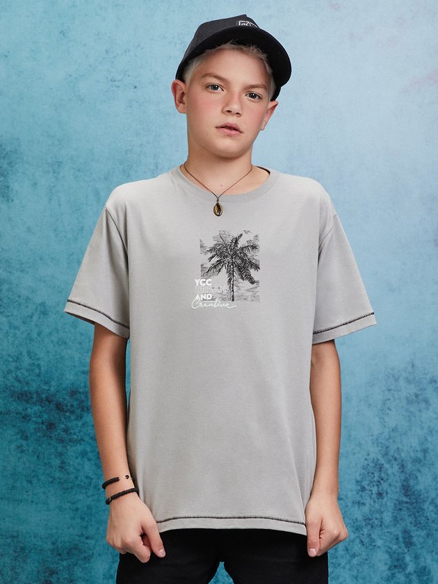 Camiseta cinza da Youccie com estampa de palmeira, perfeita para looks descontraídos e tropicais. Em tecido leve, é ideal para compor visuais frescos e modernos para os dias de sol.