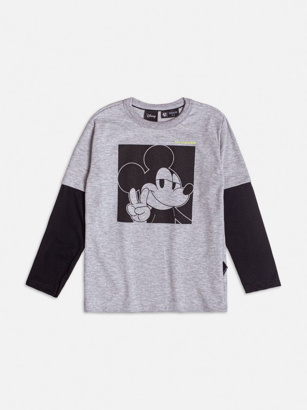 O Mickey Mouse aparece com um toque urbano e moderno nesta blusa cinza com mangas contrastantes. O print frontal em preto e branco traz um ar cool e estiloso, enquanto as mangas pretas adicionam um efeito visual marcante. Perfeita para meninos que curtem um visual descolado e cheio de atitude. Ref.: D2602
