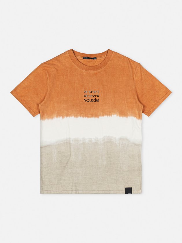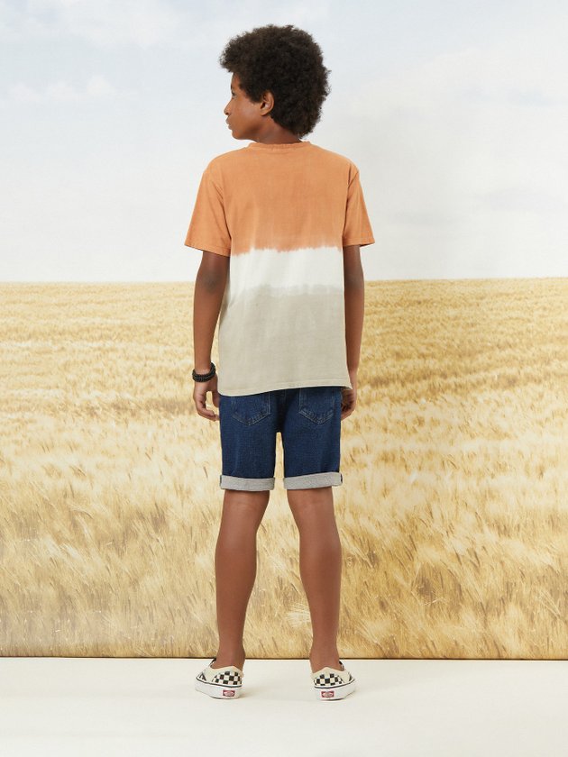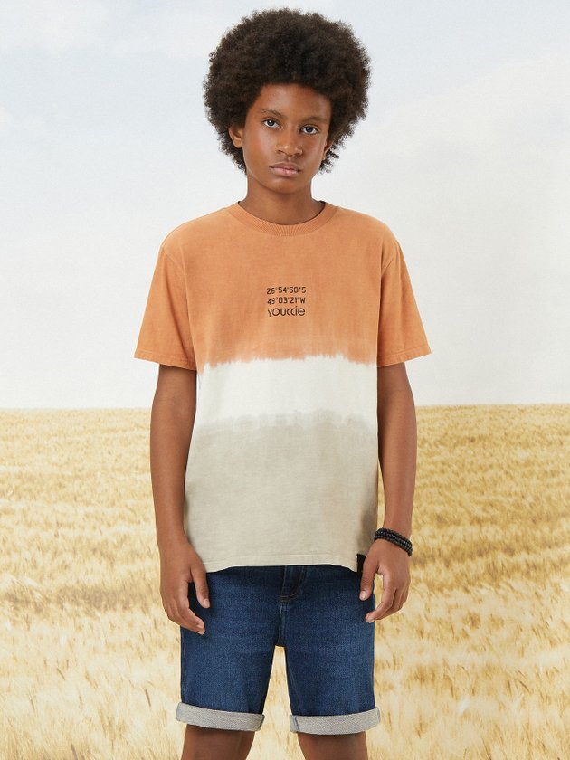 Com um efeito tie-dye que remete à natureza, esta camiseta é moderna e única. A combinação de tons terrosos adiciona um toque contemporâneo, ideal para meninos estilosos e conectados com as tendências.