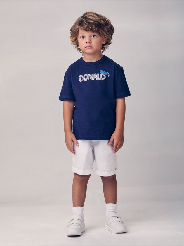 O azul marinho ganha vida com a estampa vibrante do Donald Duck, criando uma camiseta cheia de personalidade para os meninos que adoram o universo Disney. Com caimento confortável e toque macio, essa peça é perfeita para acompanhar brincadeiras, passeios e momentos de lazer durante o verão, unindo estilo, frescor e muita diversão.