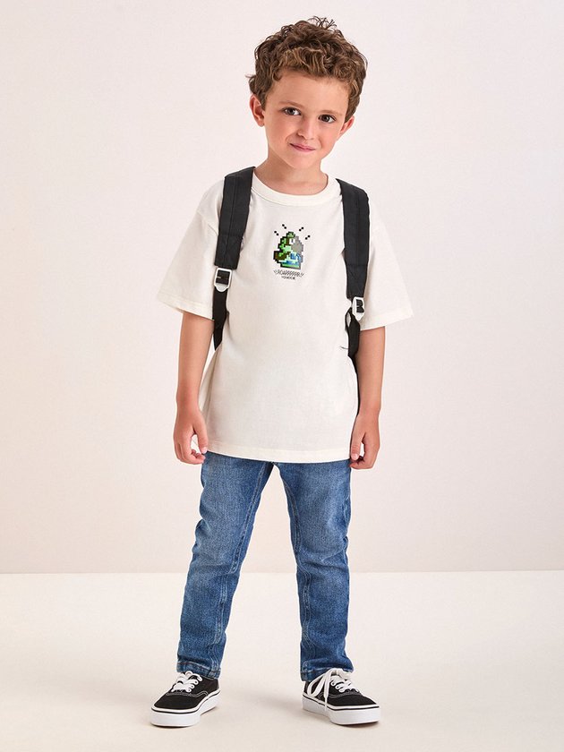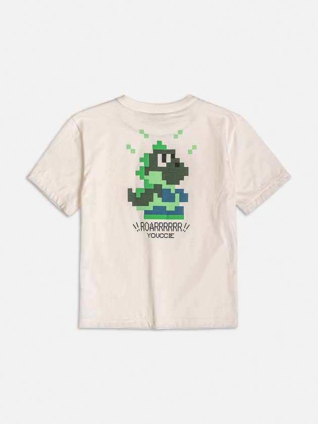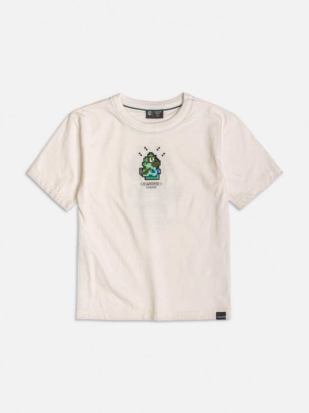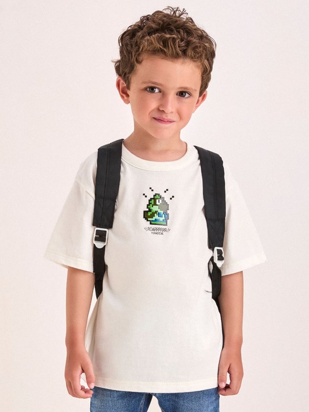Prepare-se para um rugido pixelado com a Camiseta Pixel Dino! Com uma estampa frontal de dinossauros e um dinossauro pixelado nas costas, essa camiseta off white combina o universo dos games com a paixão pelos dinossauros. Ideal para os pequenos fãs de tecnologia e aventuras!