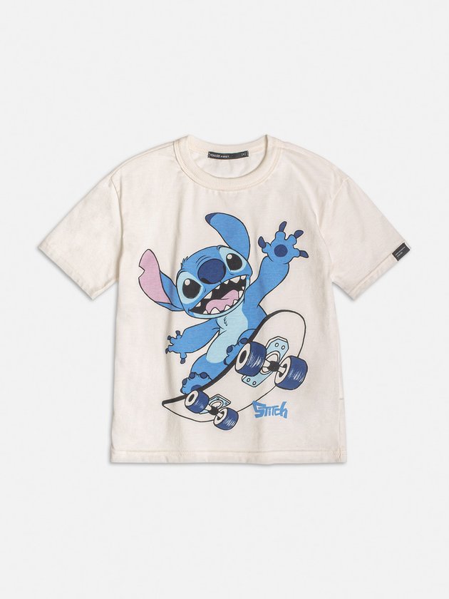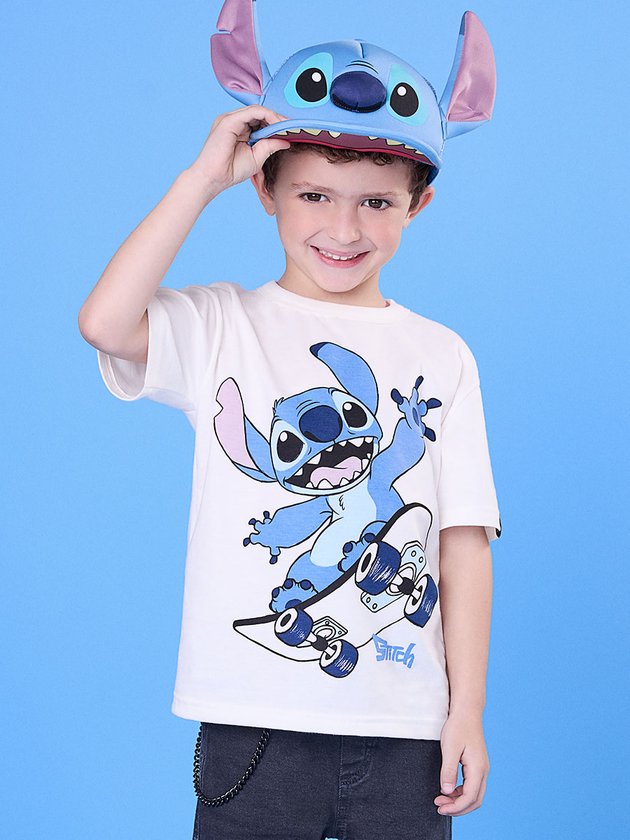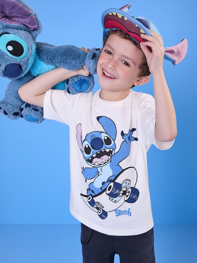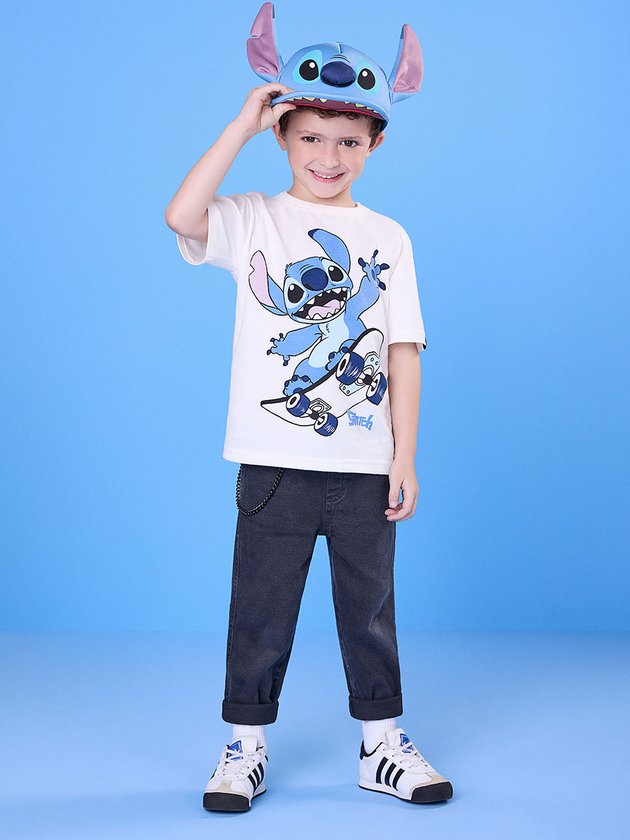 A Camiseta Off White do Stitch é perfeita para os dias mais quentes, trazendo leveza e diversão ao look dos meninos. O decote em ribana e a estampa frontal do personagem Stitch, licenciada pela Disney, garantem um visual moderno e descontraído. A barra e as mangas com bainha e a etiqueta Disney no decote costas interna adicionam detalhes únicos que valorizam a peça. Uma escolha sofisticada e confortável para os pequenos fãs de Stitch. Ref.: I2141