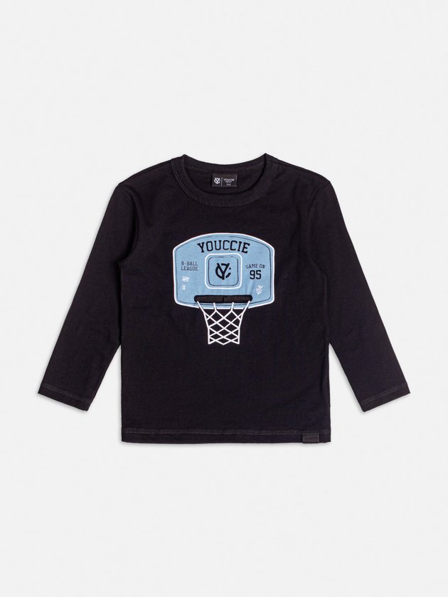 Para os fãs de esportes, esta camiseta longa preta da Youccie traz uma estampa inspirada no basquete, com aro e bola em relevo. Estilo urbano e moderno para meninos cheios de atitude. Ref.: I2064