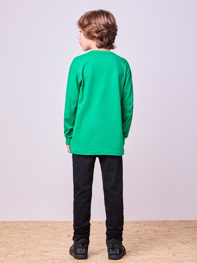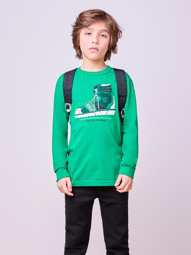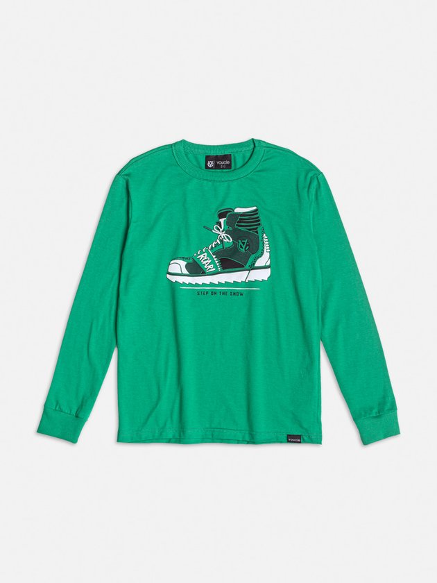 A vibe esportiva do inverno chegou! Essa camiseta de manga longa verde traz uma estampa inspirada nos esportes de neve, com um tênis cheio de detalhes estilosos. Confortável e cheia de personalidade, é a escolha perfeita para looks descontraídos e cheios de atitude.