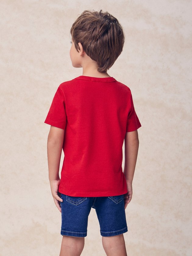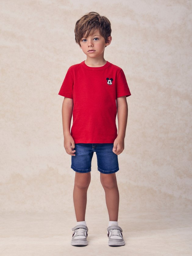 Com um visual atemporal, a camiseta vermelha traz o clássico bordado do Mickey no peito, garantindo charme e personalidade sem perder a praticidade. Feita em malha confortável e modelagem básica, é perfeita para o dia a dia dos meninos, podendo ser combinada com diferentes estilos para um look moderno e descontraído.