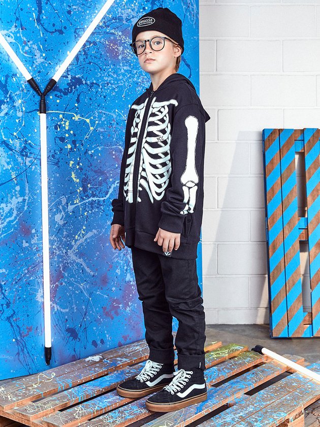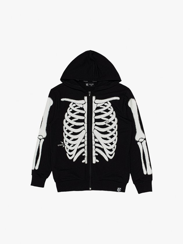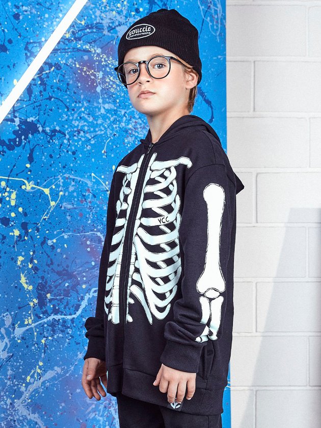 Jaqueta de moletom preta Youccie é pura modernidade trazendo ainda mais estilo para o guarda roupa dos meninos, em seus detalhes traz acabamento na barra e punhos em ribana, estampa frente e nas mangas com esqueleto que brilha no escuro, super irado do jeito que os meninos amam, a peça ainda traz modelagem básica, etiqueta clips e capuz. Composição: 100% algodão. Ref.: D0913