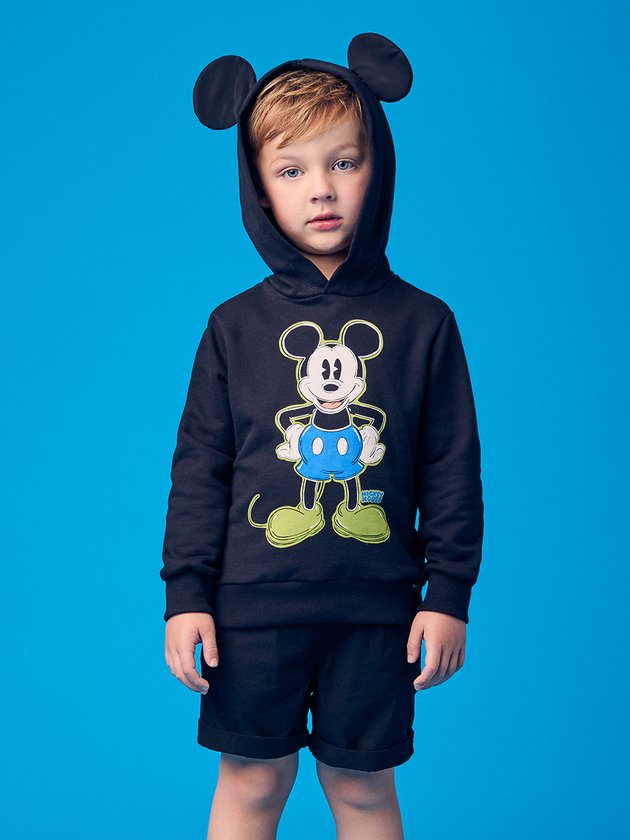 O Blusão Infantil do Mickey com Orelhinhas é a peça que transforma qualquer look básico em algo cheio de personalidade. Produzido em moletom macio e confortável, oferece aquele toque quentinho ideal para os dias frios. A estampa frontal maxi do Mickey adiciona um visual divertido e moderno que chama atenção de longe. O capuz com orelhinhas deixa tudo ainda mais fofo e adorável, trazendo um charme único para a peça. Com punhos e barra em ribana para melhor vestibilidade, ele combina facilmente com jeans, joggers ou calças de moletom, criando looks práticos para escola, passeios ou momentos relax em casa. Uma escolha estilosa e funcional para o guarda-roupa infantil.