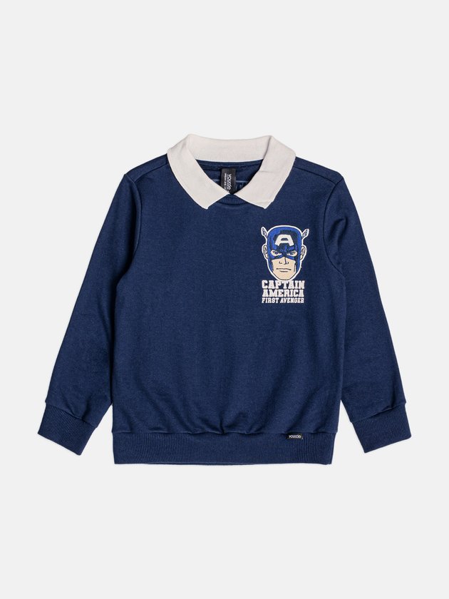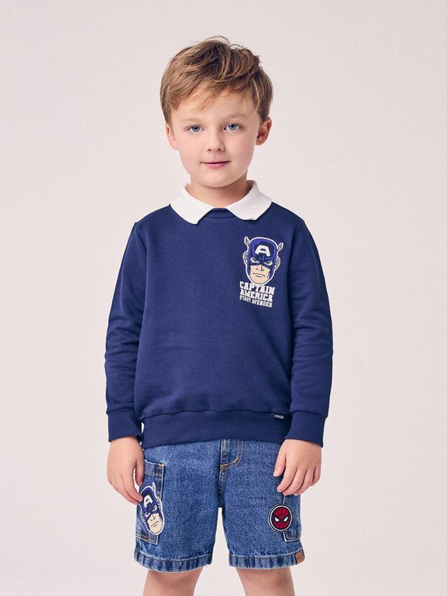 O Casaco Infantil do Captain America com Golinha combina conforto, estilo e o charme do universo Marvel em uma única peça. Produzido em moletom macio e encorpado, é perfeito para manter os pequenos aquecidos com leveza. A gola polo branca cria um contraste elegante com o azul marinho, trazendo um toque mais arrumadinho ao visual. No peito, a estampa licenciada do Captain America adiciona personalidade e aquele ar heroico que as crianças adoram. Os punhos e a barra em ribana deixam o ajuste firme e confortável, enquanto a modelagem soltinha permite total liberdade de movimento. Uma peça versátil, estilosa e ideal para o dia a dia.