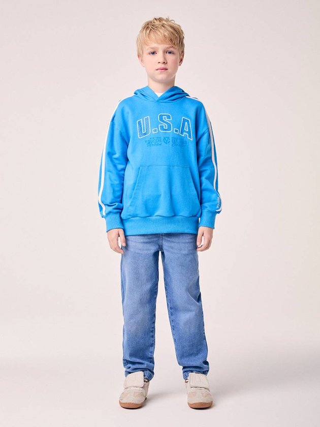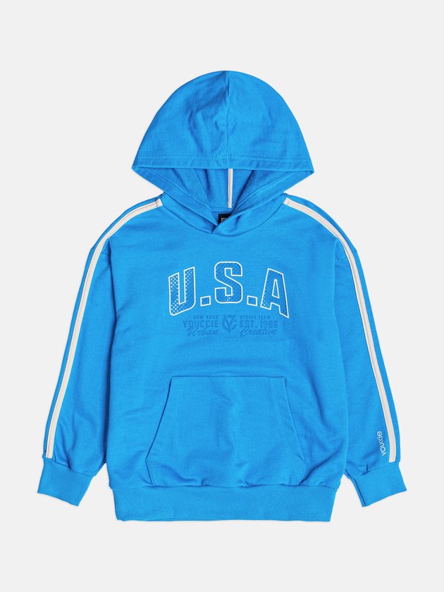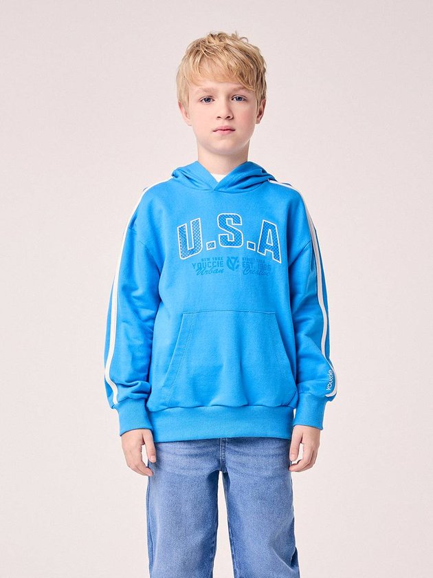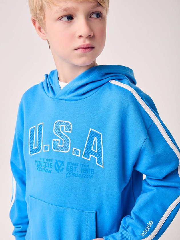 Inspirado na estética esportiva americana e no estilo preppy da coleção YCC Racing, o Casaco Infantil Estampado com Capuz Youccie é perfeito para meninos que amam conforto e autenticidade. Confeccionado em moletom felpado de toque macio, o modelo apresenta estampa frontal U.S.A em destaque e listras aplicadas nas mangas, que trazem um ar atlético e moderno. O bolso canguru adiciona praticidade, enquanto o capuz e os punhos em ribana garantem proteção nos dias frios. Uma peça versátil, que combina com diferentes looks e traduz o espírito esportivo e urbano da Youccie. Ref.: D2932