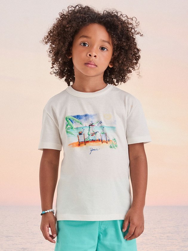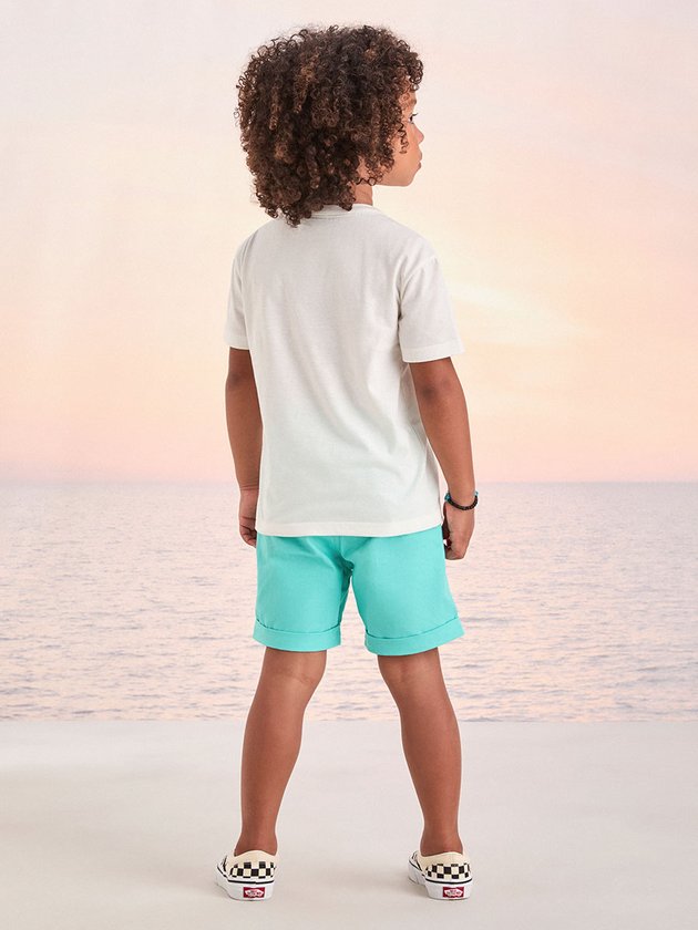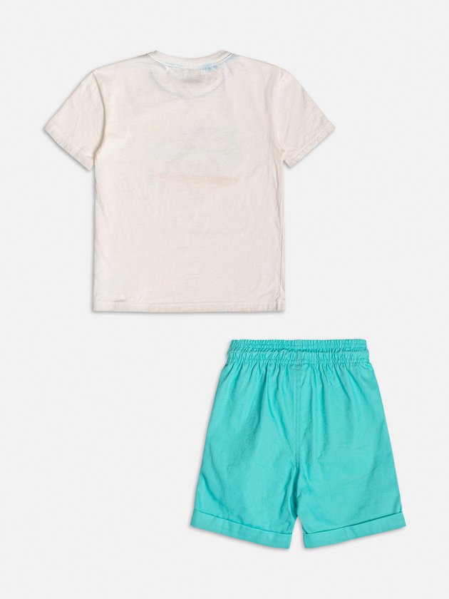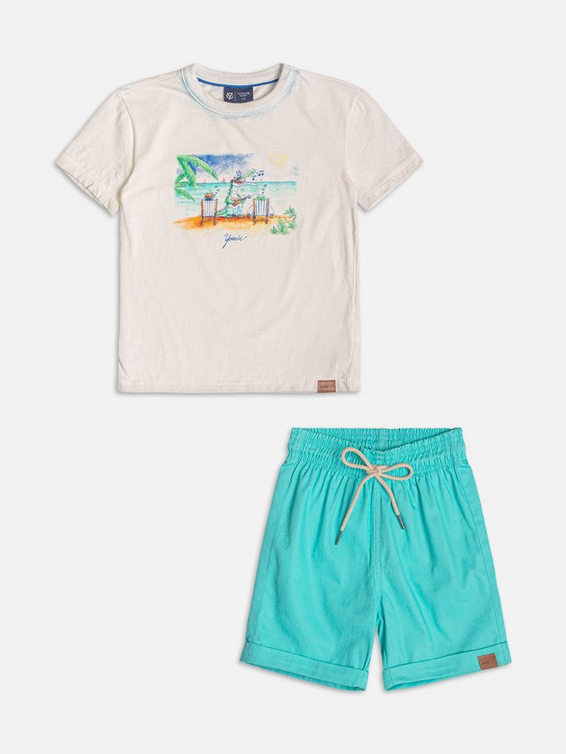 Mergulhe no clima de verão com este conjunto alegre e confortável! A camiseta off white com estampa de praia combina perfeitamente com a bermuda acqua, trazendo um visual refrescante e moderno. Feito com tecidos leves, é perfeito para manter os pequenos frescos e estilosos durante todo o dia.