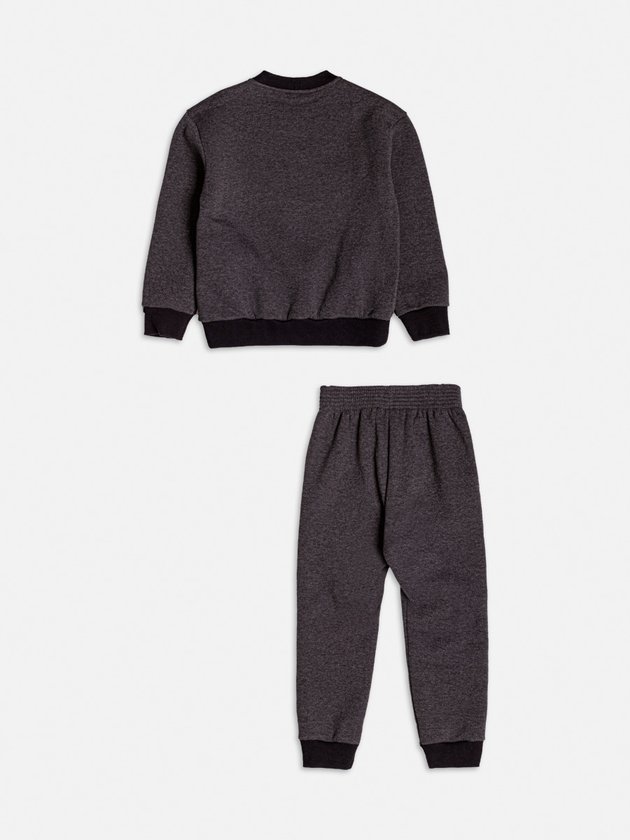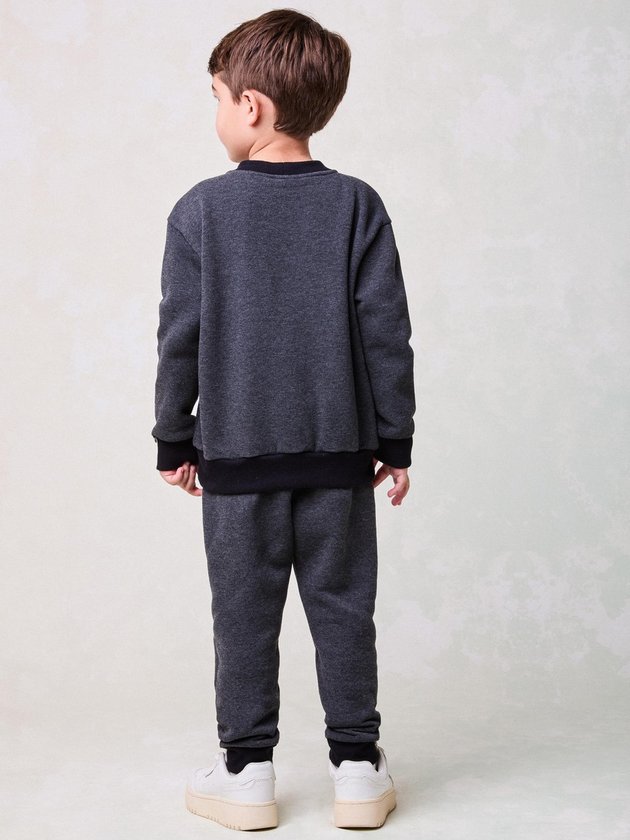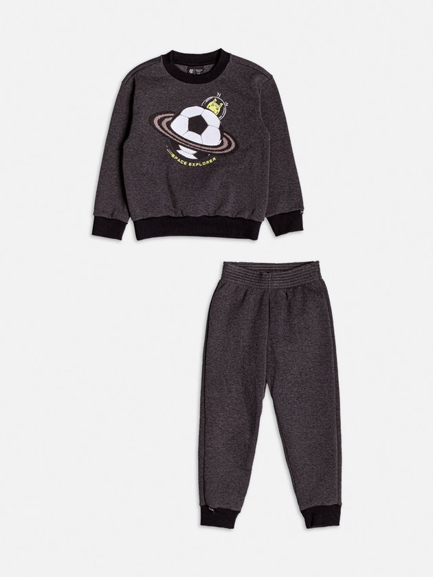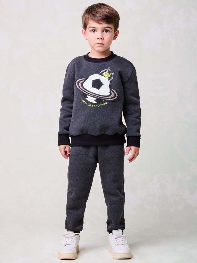 Com estampa que mistura o universo dos dinossauros com o espaço sideral, este conjunto em moletom mescla escuro é puro estilo. O destaque vai para o dinossauro astronauta ao lado da bola de futebol, rodeada por anéis planetários e a frase "Space Explorer". Ideal para os meninos que adoram aventuras intergalácticas!