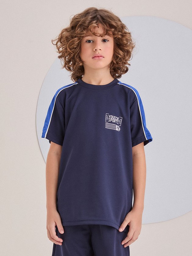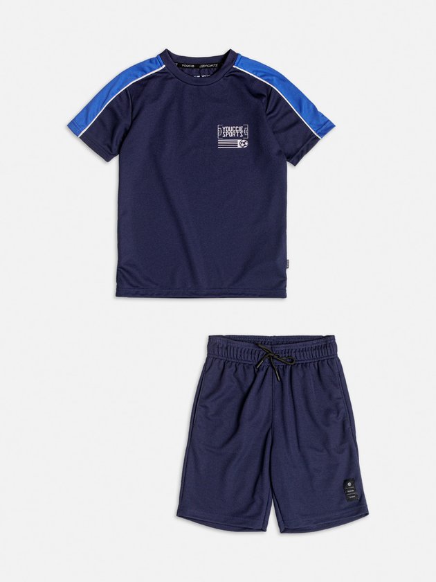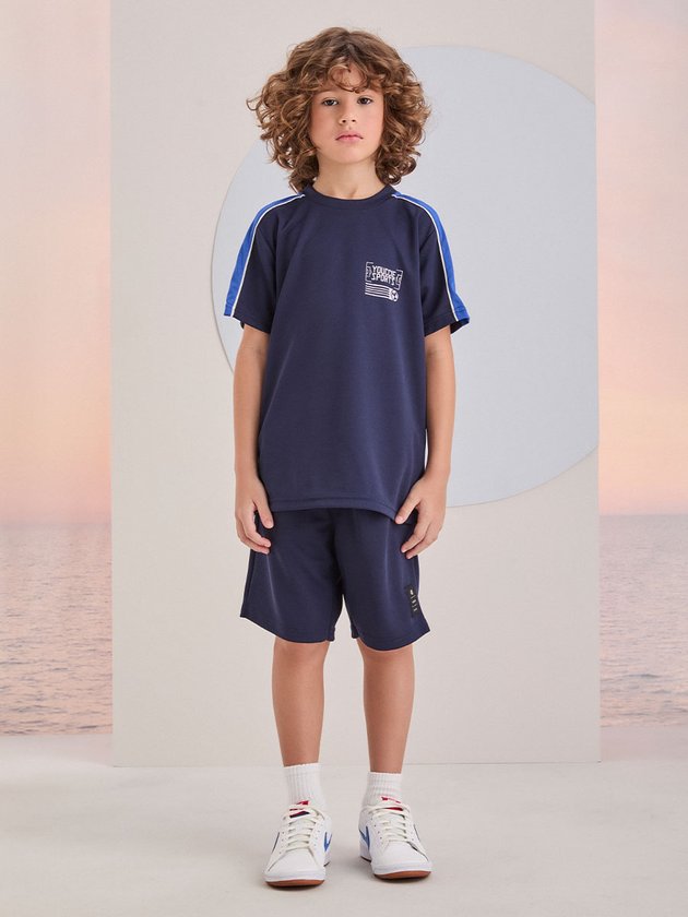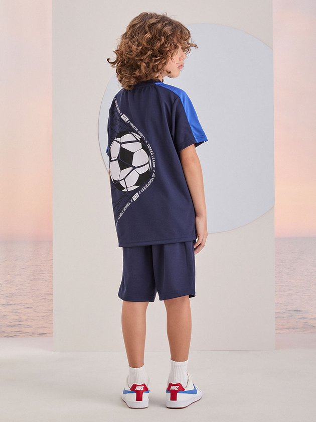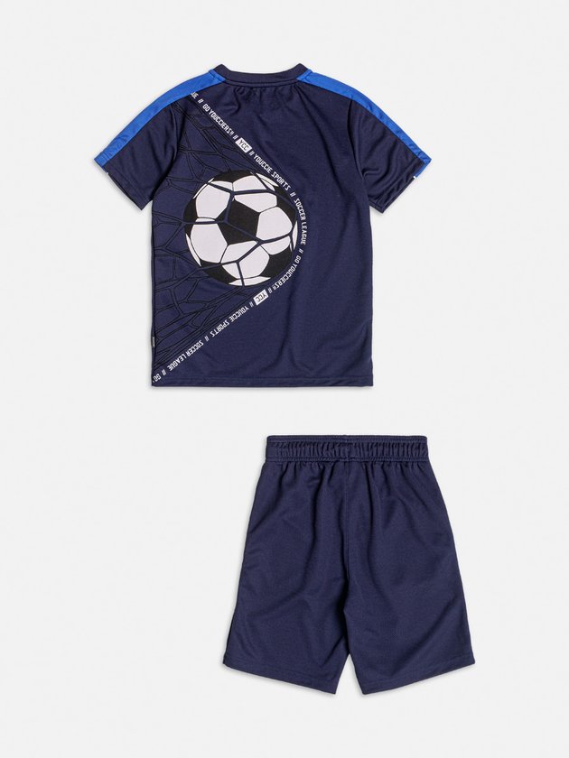 Ideal para os pequenos amantes de futebol, este conjunto esportivo é composto por uma camiseta e bermuda azul marinho com detalhes em branco e uma estampa de bola de futebol nas costas, oferecendo conforto e estilo durante as atividades.