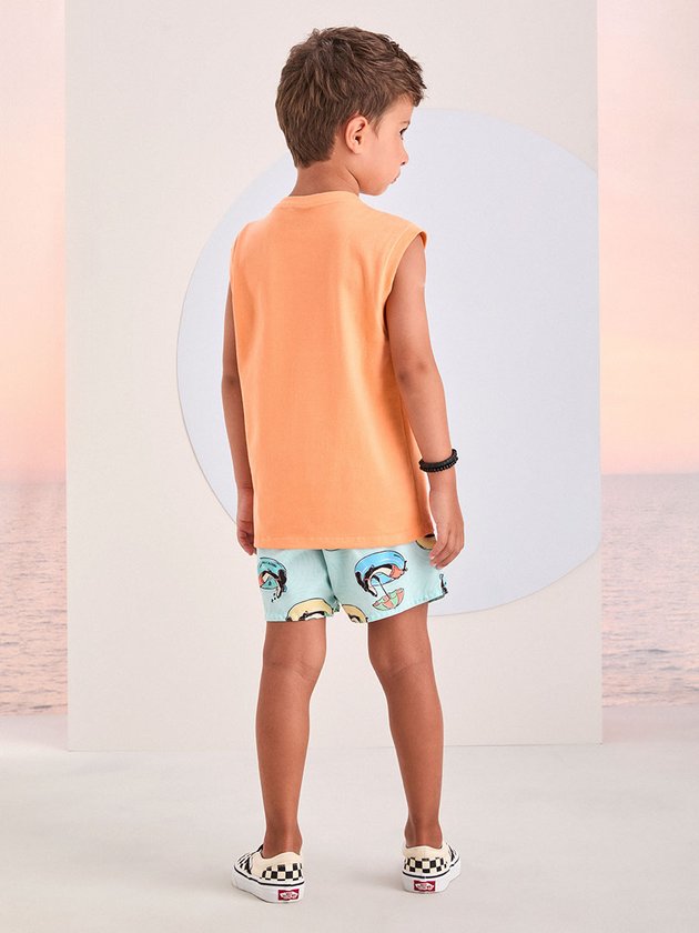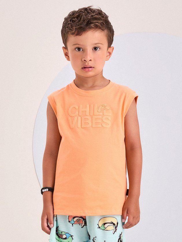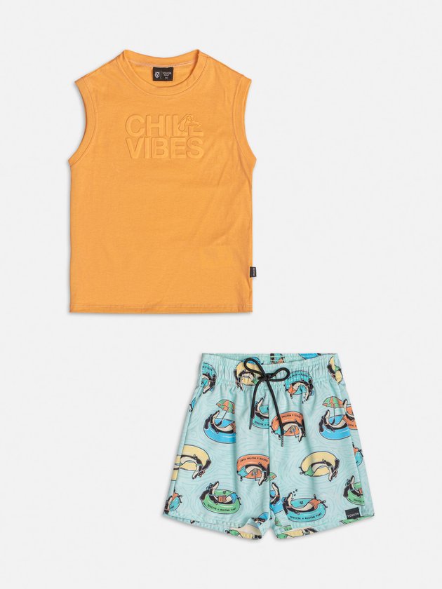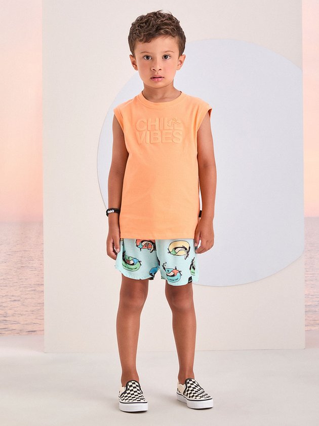 Para um look descontraído e cheio de personalidade, este conjunto apresenta uma camiseta sem mangas laranja com a frase "Chill Vibes" em relevo e uma bermuda com estampa divertida de boias, perfeita para os dias de lazer.