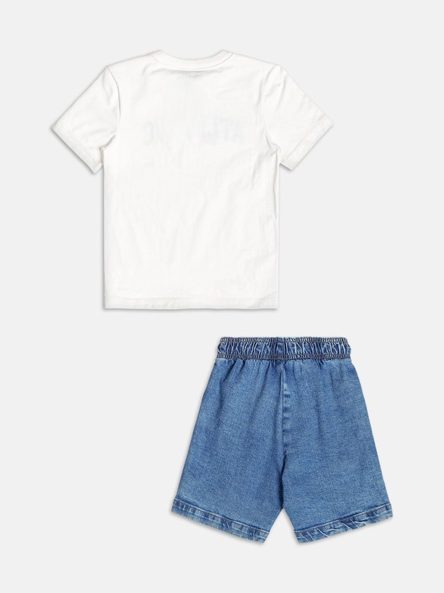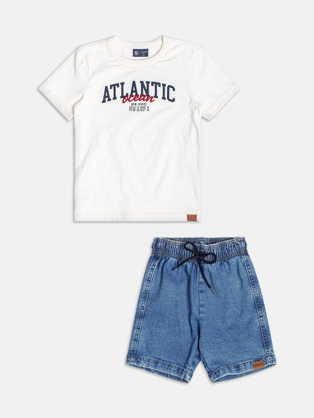 Com mood fresh e vibe praiana, o conjunto jeans azul Atlantic traduz o espírito leve do verão em um look descomplicado e cheio de estilo. A camiseta off white ganha destaque com lettering atlântico em contraste e detalhe em vermelho, inspirando passeios à beira-mar e dias de sol. O short jeans azul completa o visual com conforto e praticidade, ideal para todas as aventuras da estação. Um combo moderno e versátil, perfeito para meninos que gostam de explorar o verão com liberdade. Ref.: I2406