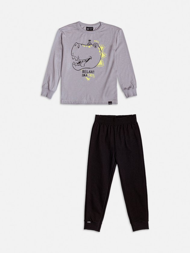 Com visual moderno e toque divertido, o conjunto traz uma camiseta de manga longa com estampa de dinossauro e a frase "Relax! I'm a T-Rex", em mix de cinza e neon. A calça preta completa o look com praticidade e conforto. Um visual urbano que combina com todas as aventuras do dia a dia.