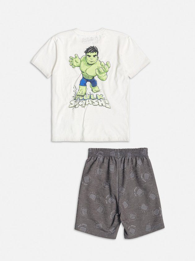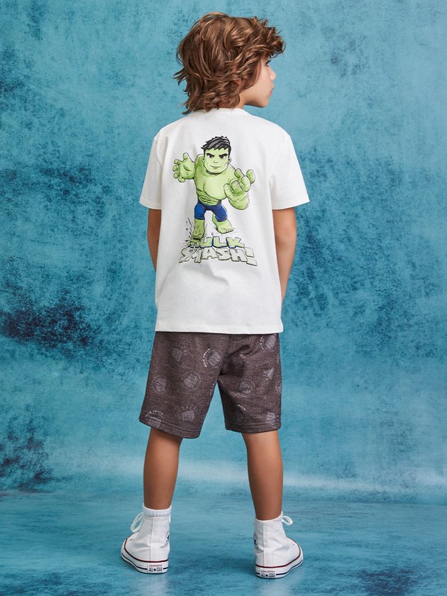 Conheça o conjunto de menino Youccie, uma incrível collab com a Marvel, trazendo estampas do Hulk frente e costas. Composto por camiseta e bermuda, o elástico no cós garante ajuste perfeito para dias cheios de diversão. Detalhe especial da etiqueta decorativa na barra, adicionando um toque autêntico ao visual. Deixe seu pequeno herói arrasar com estilo e modernidade! Composição - Camiseta: 100% algodão. Bermuda: 60% algodão e 40% poliéster. Ref.: I1209