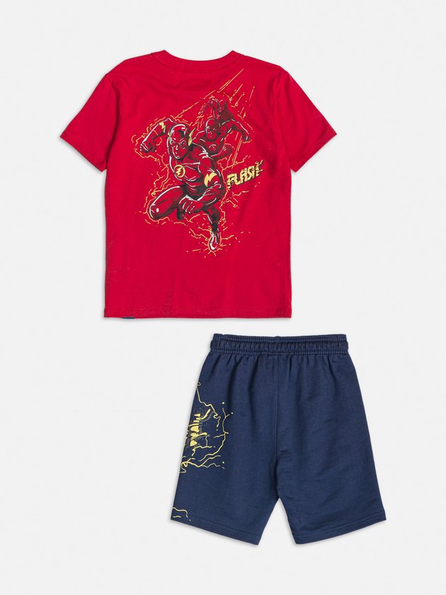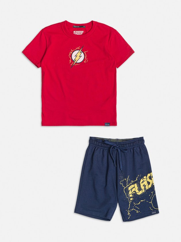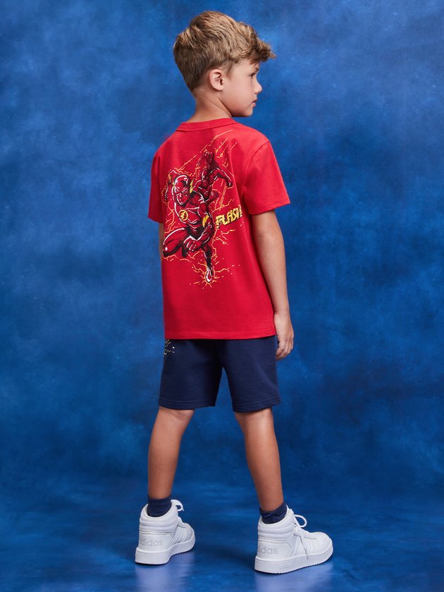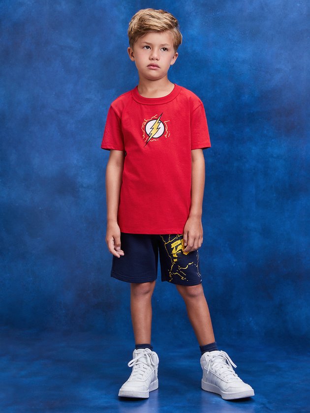 conjunto infantil Youccie, inspirado no herói Flash, é perfeito para meninos cheios de energia. A camiseta em malha vermelha traz o emblema icônico do Flash, enquanto a bermuda de moletom com elástico garante conforto e mobilidade para as aventuras do dia a dia. Composição: 100% algodão. Ref.: I1238