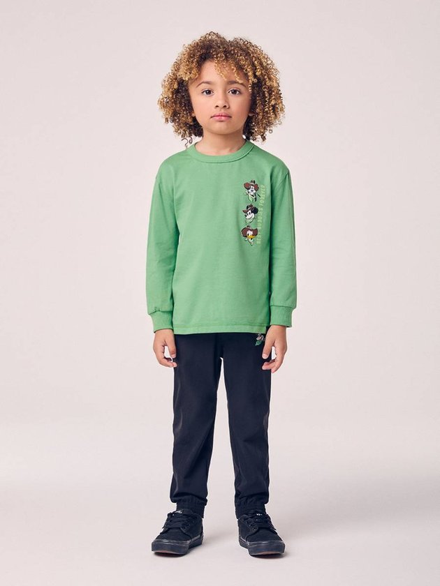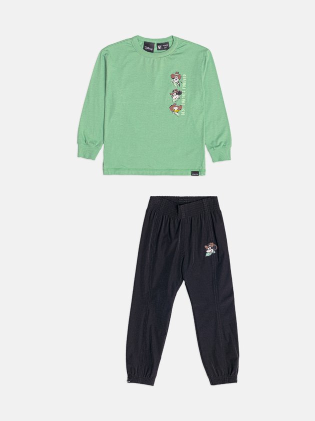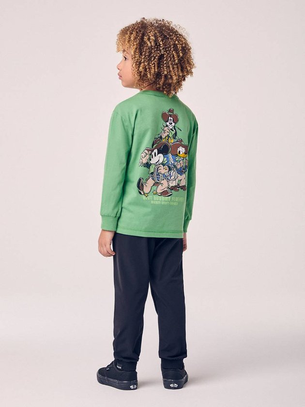 O Conjunto Infantil Country do Mickey e Amigos aposta em uma proposta descontraída, misturando conforto e um toque aventureiro. A blusa verde manga longa traz uma composição vertical dos personagens em versão cowboy, criando um visual fofo e cheio de atitude. O tecido é suave, garantindo uma peça agradável de usar o dia todo. A calça preta acompanha com cintura confortável e um detalhe do Mickey próximo ao bolso que fecha o look de forma equilibrada. É aquele conjunto prático para escola, passeios e rotina, entregando liberdade de movimento e um charme irresistível dos clássicos da Disney em clima country.