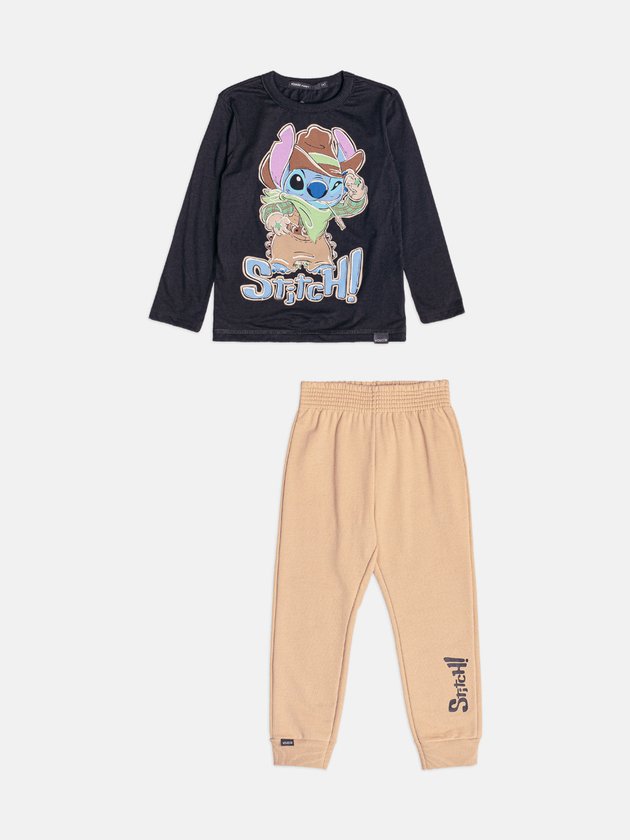 O Conjunto Infantil do Cowboy Stitch aposta no estilo divertido que as crianças adoram. A camiseta preta traz o Stitch em versão caubói, com estampa grande e supercolorida que destaca o personagem de forma marcante. O tecido tem toque agradável, garantindo conforto para brincar o dia todo. A calça bege entra como complemento leve e versátil, com cós confortável, punhos ajustados e estampa Stitch na perna, criando unidade visual sem pesar no look. É aquele conjunto prático para o dia a dia, perfeito para quem ama o universo Lilo & Stitch e curte peças estilosas, confortáveis e com muita personalidade.