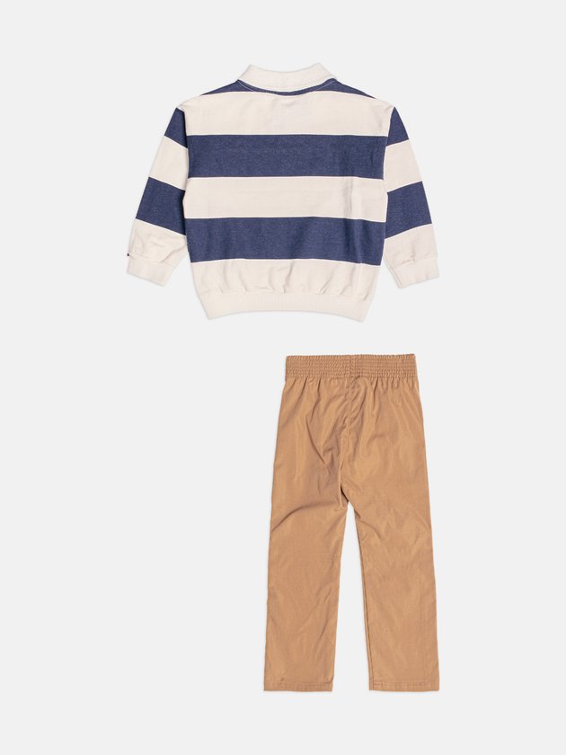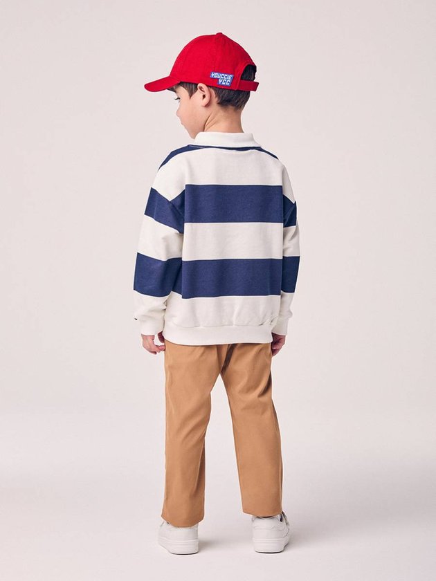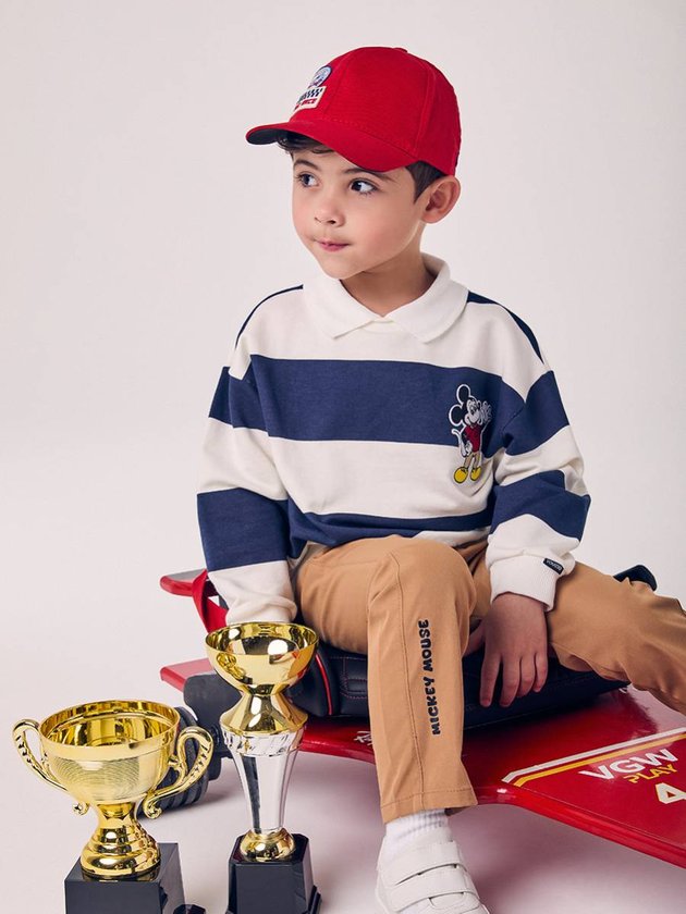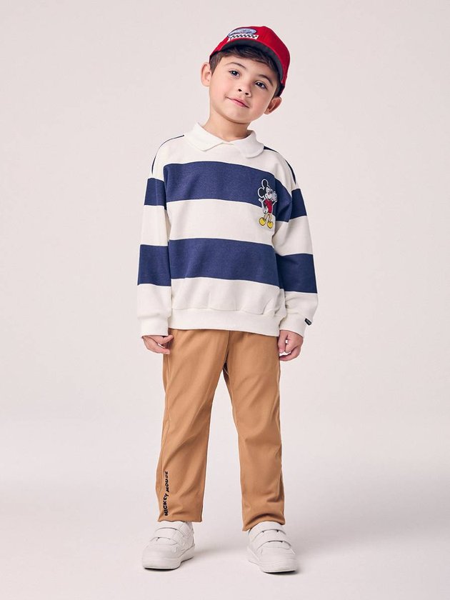 O Conjunto Infantil do Mickey com Golinha combina estilo clássico com conforto para o dia a dia. A blusa apresenta listras largas em marinho e off, golinha aplicada que dá um toque arrumado e patch bordado do Mickey, trazendo personalidade ao look. A modelagem é macia e aconchegante, perfeita para dias mais frescos. A calça em tom caqui completa o conjunto com leveza e praticidade, oferecendo liberdade de movimento e encaixando bem em diversas ocasiões, desde passeios até compromissos escolares. É um conjunto versátil, charmoso e pensado para quem ama o Mickey em uma proposta moderna.