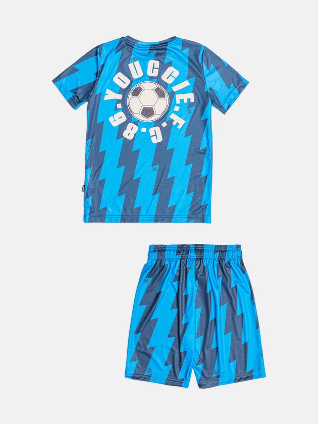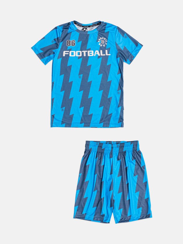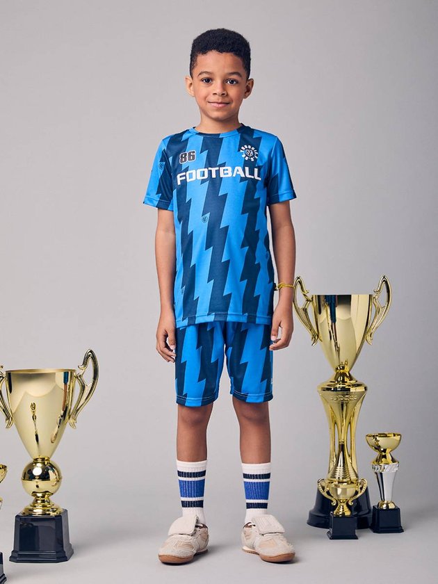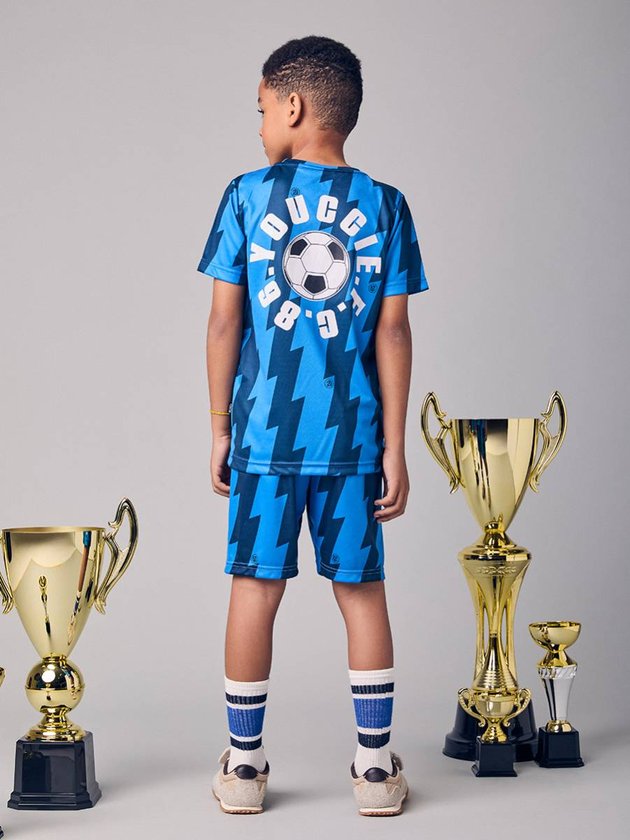 O Conjunto Infantil Dry de Football Youccie une performance e estilo em um visual moderno. Confeccionado em malha dry fit, o tecido leve e respirável garante conforto térmico e liberdade de movimento. A camiseta azul com estampa geométrica traz o lettering Football e número 86, em referência ao espírito esportivo da marca. A Bermuda Menino Youccie acompanha o design, completando o conjunto com equilíbrio e estilo. Ideal para atividades físicas, passeios ou momentos de lazer, é o look certo para meninos cheios de energia.