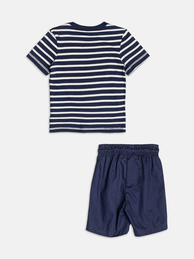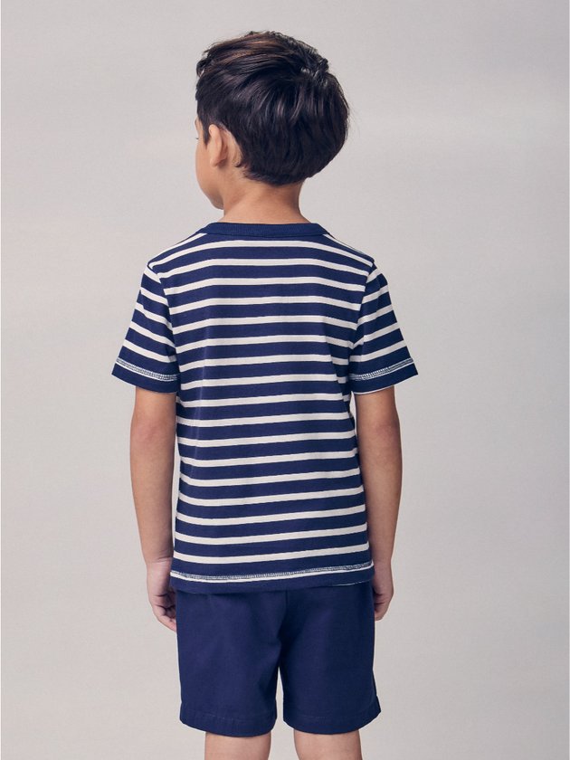 Com inspiração náutica e mood divertido, o conjunto navy listrado do Mickey é aposta certeira para um verão cheio de estilo. A camiseta de listras azul-marinho e off ganha aplicação do icônico Mickey com chapéu de marinheiro, trazendo o universo Disney para o visual de um jeito lúdico e criativo. O short azul-marinho complementa o combo com assinatura do personagem, garantindo praticidade e conforto para todas as aventuras à beira-mar ou passeios na cidade. Um look fresh e autêntico para meninos que amam novidades e não abrem mão do conforto. Ref.: I2358