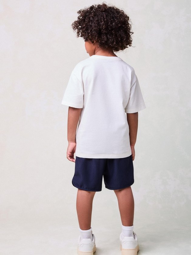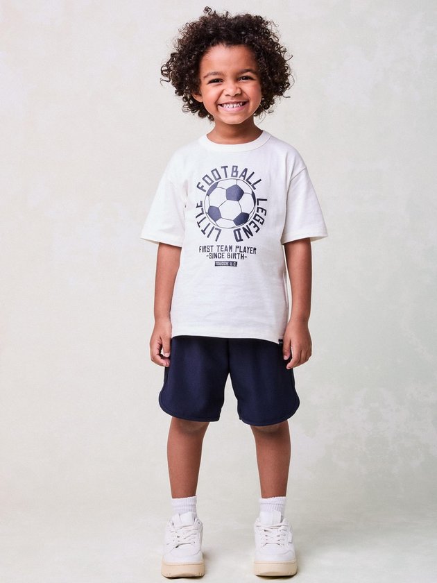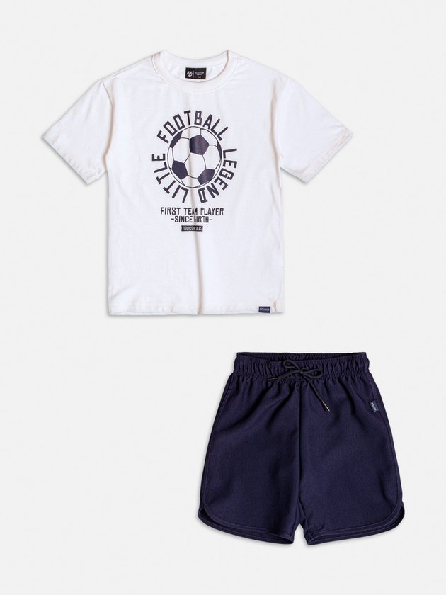 Inspirado nos uniformes dos pequenos atletas, este conjunto com camiseta off e shorts azul é a escolha certa para quem vive no modo futebol. Estilo e conforto garantidos para os dias de ação.