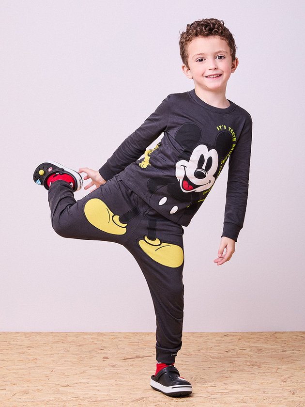 Com um visual divertido e cheio de atitude, o conjunto longo do Mickey aposta em uma estampa posicionada que alinha a parte de cima e a calça de forma criativa. O visual 100% Disney que rouba a cena.