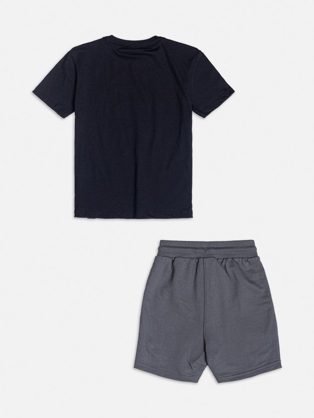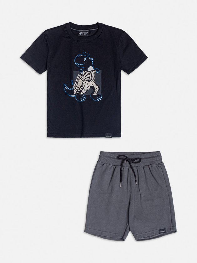 Para os meninos que amam dinossauros, este conjunto é a opção perfeita! A camiseta preta com estampa divertida de dinossauro se destaca, enquanto a bermuda cinza proporciona conforto e liberdade de movimento. Uma combinação moderna e cheia de atitude para o dia a dia.
