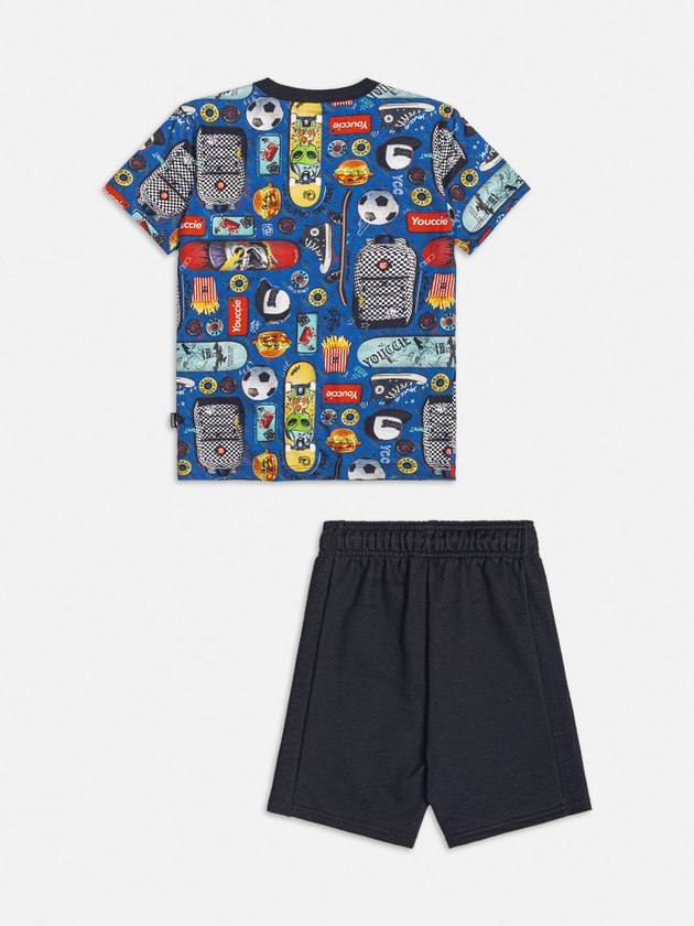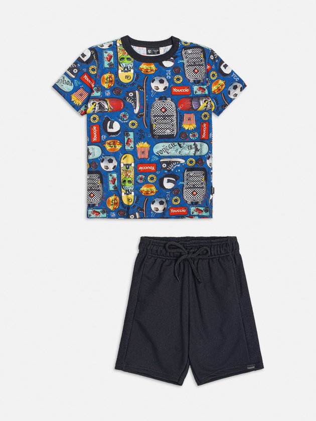 Conjunto infantil Youccie composto por camiseta preta com estampa de temas esportivos e bermuda de moletom preto. Um look estiloso para eles se divertirem em diversas ocasiões. Possui elástico e cadarço no cós para maior conforto. Composição: 100% algodão. Ref.: Y0728