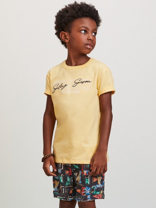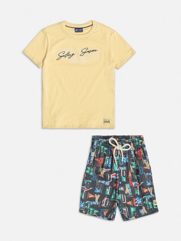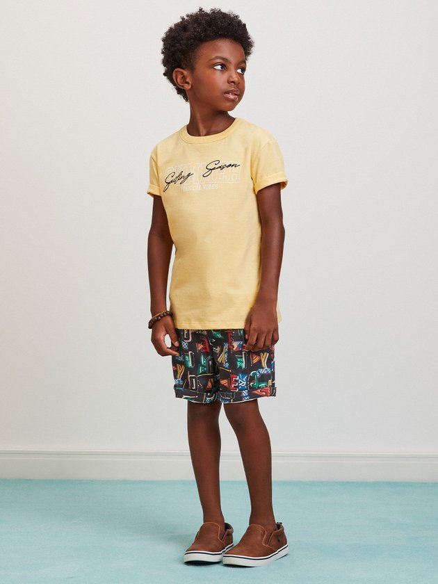 O conjunto infantil Youccie é uma opção alegre para os meninos aproveitarem momentos de diversão. A camiseta amarela, confeccionada em malha, possui uma estampa na parte da frente que adiciona um toque de personalidade ao visual. Complementando o conjunto, a bermuda estampada, com cós elástico e cadarço, garante conforto durante as atividades. Composição: 100% algodão. Ref.: I1556
