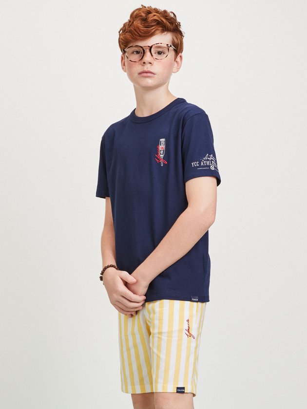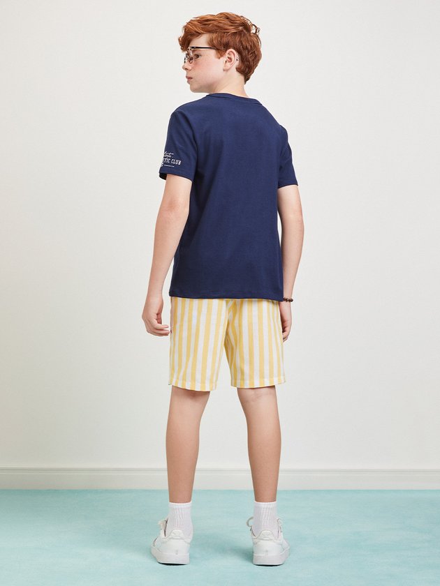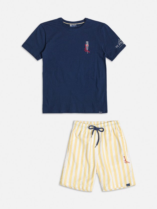 O conjunto Youccie é a opção prática e estilosa para meninos. A camiseta em malha estampada adiciona um toque de personalidade ao visual, enquanto a bermuda em tecido listrado oferece um design moderno. O cós com elástico e cadarço garante um ajuste perfeito e confortável. Composição - Camiseta: 100% algodão. Bermuda: 100% fibras diversas. Ref.: D1981