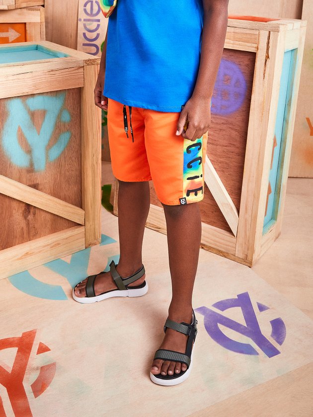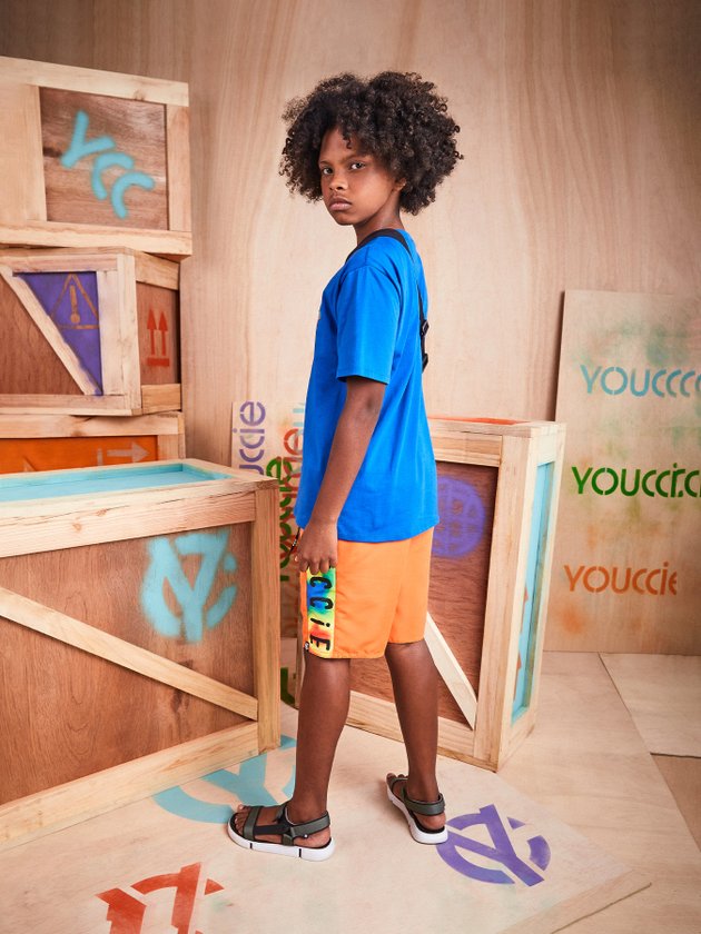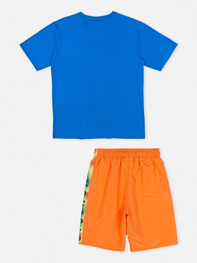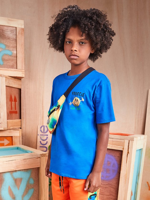 O Conjunto Infantil Youccie é composto por camiseta azul e bermuda colorida, desenvolvidos em malha confortável que em seus detalhes na parte de cima conta com gola em ribana e lateral com etiqueta decorativa. A Bermuda traz elástico no cós, cadarço funcional, lateral colorida e etiqueta youccie na perna. Composição - Bermuda: 100% Poliéster. Camiseta: 100% Algodão. Ref.: D1373