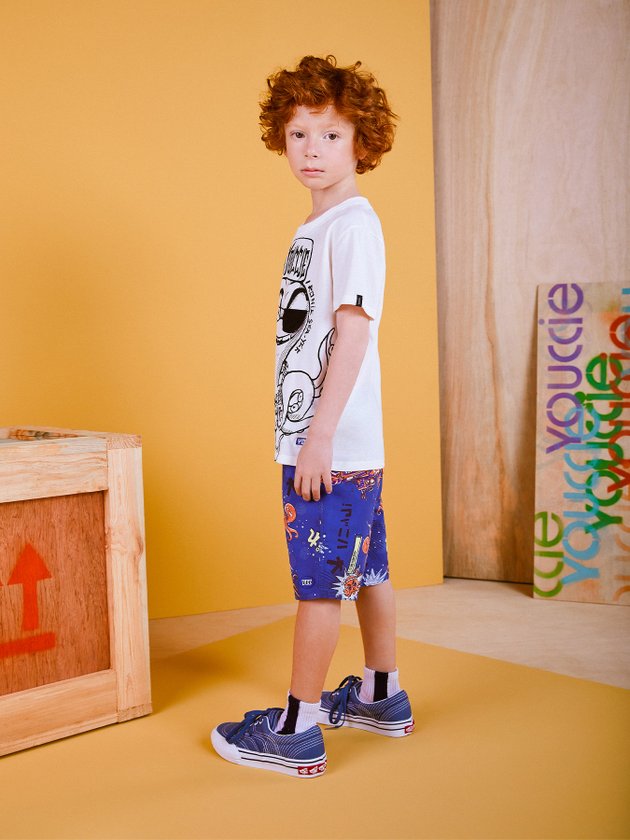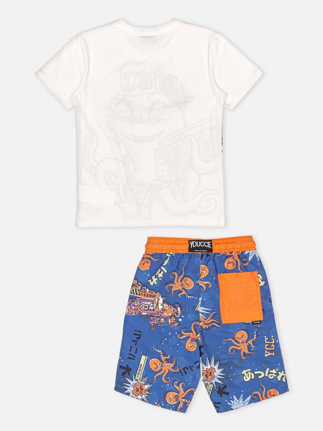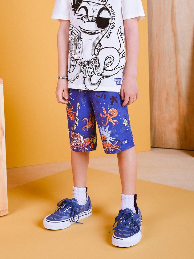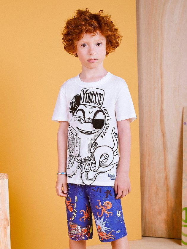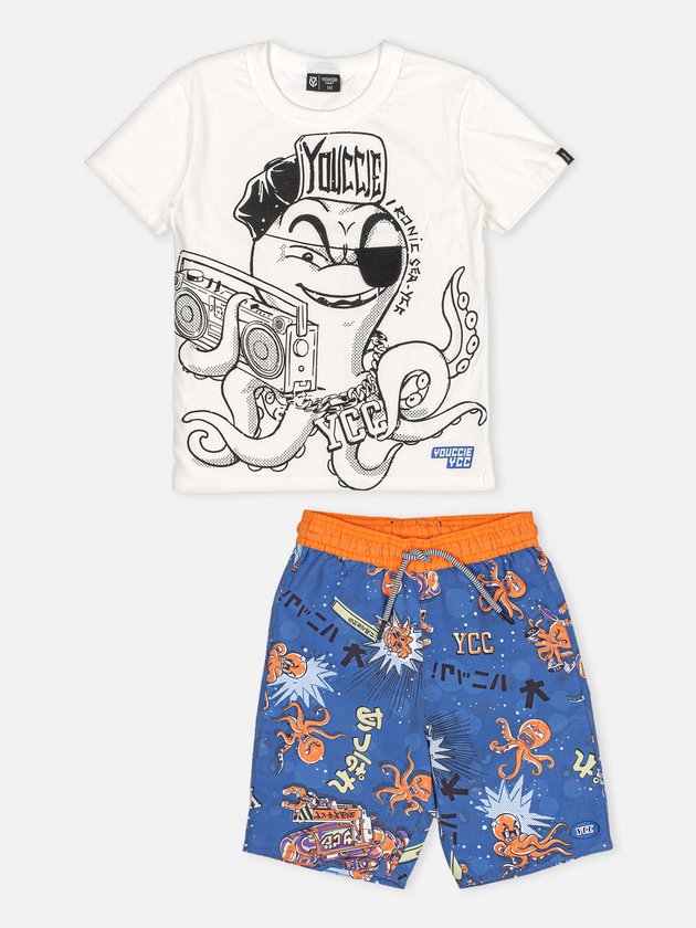 Esse Conjunto Irado Youccie é composto por camiseta e bermuda, ambos com estampa exclusiva de polvo no fundo do mar. Nos detalhes a parte de cima possui decote em ribana, aplicação de tapa olho em malha e modelagem slim. A bermuda traz cós em ribana contrastante e modelagem básica com bolso costas. Composição – Camiseta: 100% Algodão. Bermuda: 100% Poliéster. Ref.: I0856