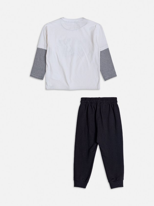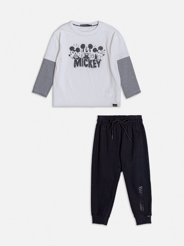 Esse conjunto de moletom é a escolha perfeita para meninos que adoram o personagem clássico da Disney. A blusa de manga longa traz uma divertida estampa vintage do Mickey, com listras nas mangas para um toque moderno e estiloso. Confeccionada em tecido macio, garante conforto ao longo do dia. A calça jogger preta, com cós elástico e ajuste por cordão, proporciona praticidade e um caimento confortável. Detalhe lateral em bordado adiciona um charme discreto à peça. Ideal para dias de lazer ou até mesmo para um passeio casual. Ref.: I1576