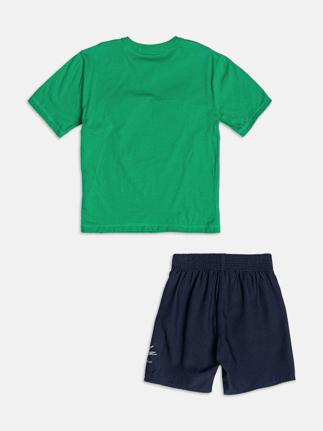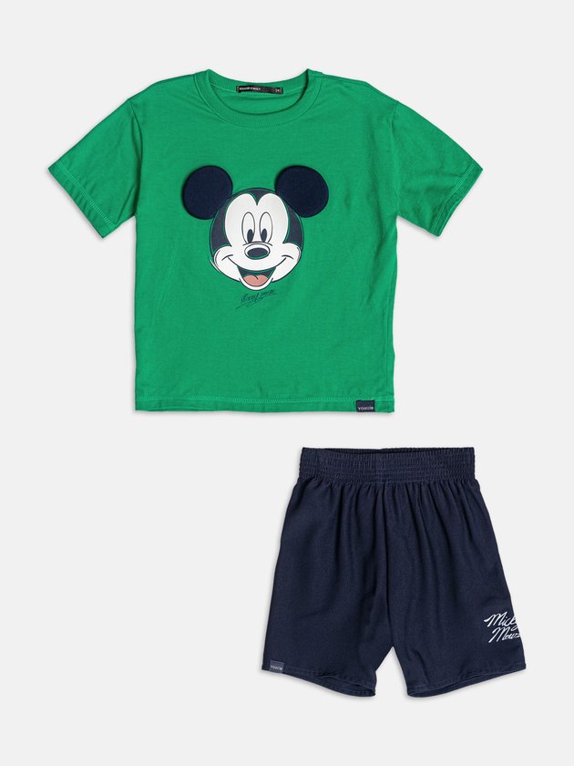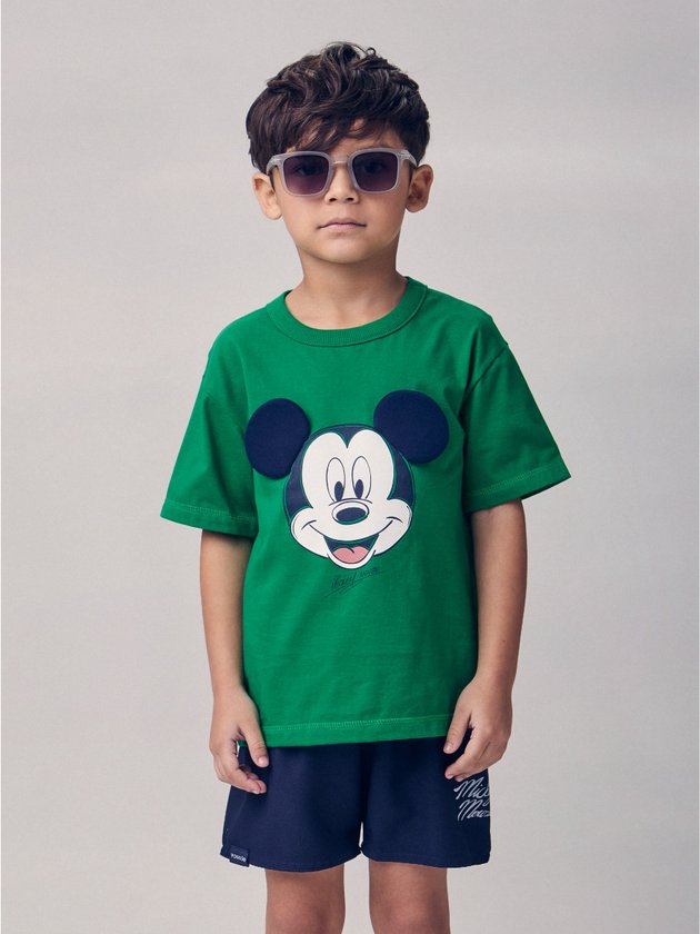 Com mood divertido e cheio de energia, o conjunto verde do Mickey é destaque garantido no verão. A camiseta traz o rosto do personagem mais famoso do mundo em relevo com orelhas 3D, criando um efeito lúdico que conquista de primeira. O short azul-marinho completa o visual com praticidade e conforto, perfeito para acompanhar as aventuras dos pequenos em qualquer ocasião. Um look que une o universo Disney ao DNA urbano e criativo da Youccie. Ref.: I2363