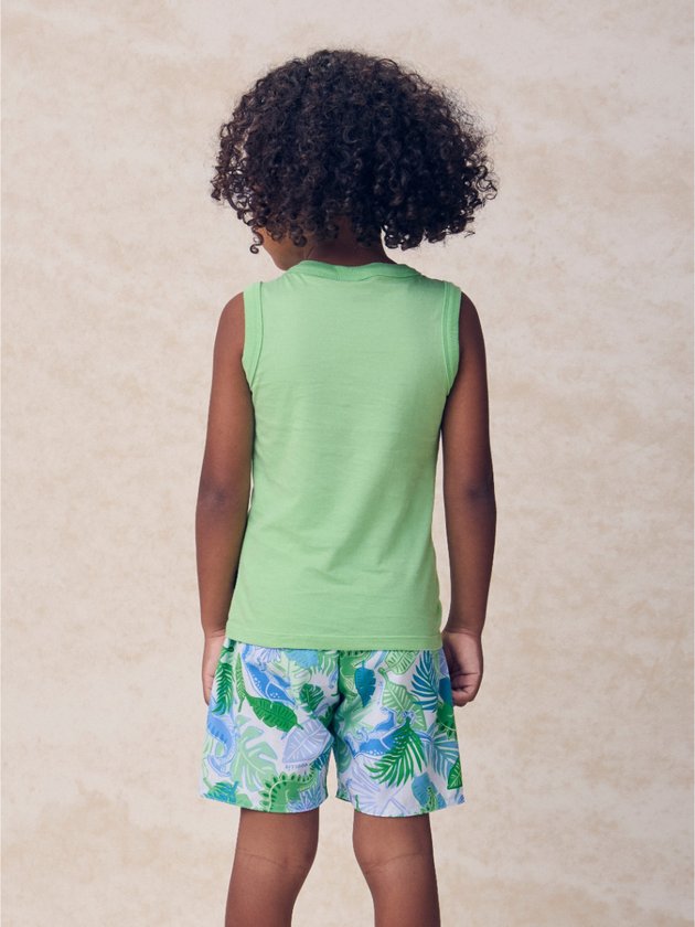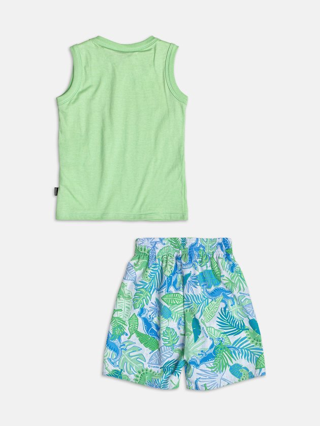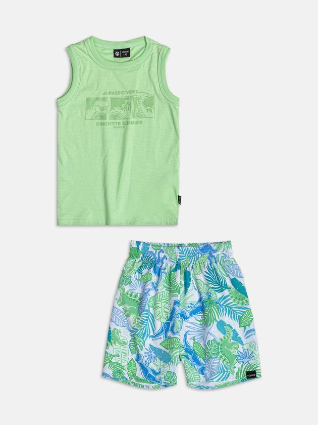 O mood jurássico chegou! O conjunto verde Jurassic Vibes traz camiseta estampada com dinossauros em visual moderno e divertido, acompanhada de bermuda confortável. Um look repleto de atitude e ideal para os pequenos exploradores do verão. Ref.: I2383