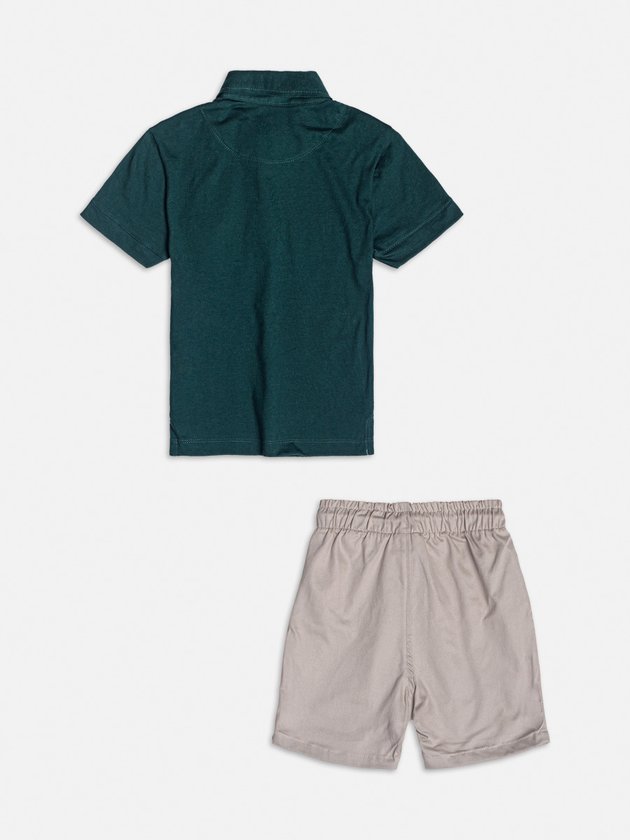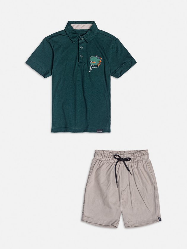 Inspirado na natureza, este conjunto traz uma polo verde com estampa de dinossauro, ideal para os pequenos que adoram animais. A bermuda bege complementa o visual com leveza e conforto, perfeita para dias de muita exploração e brincadeira.