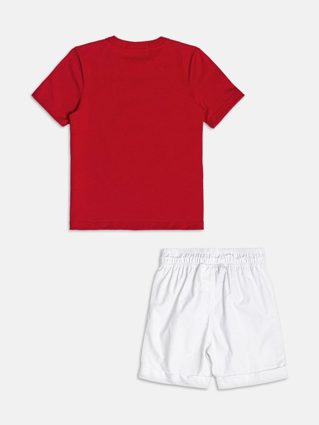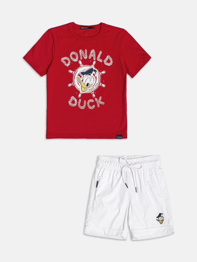 Com pegada divertida e mood náutico, o conjunto vermelho do Donald Duck é destaque nos dias de verão. A camiseta vermelha traz estampa central do Pato Donald em clima marítimo, com lettering estilizado e detalhes que remetem ao universo Disney. O short branco com aplicação do personagem completa o look com leveza e conforto, ideal para acompanhar os meninos em todas as aventuras da estação. Um combo fresh e cheio de personalidade para quem curte brincar com estilo. Ref.: I2362