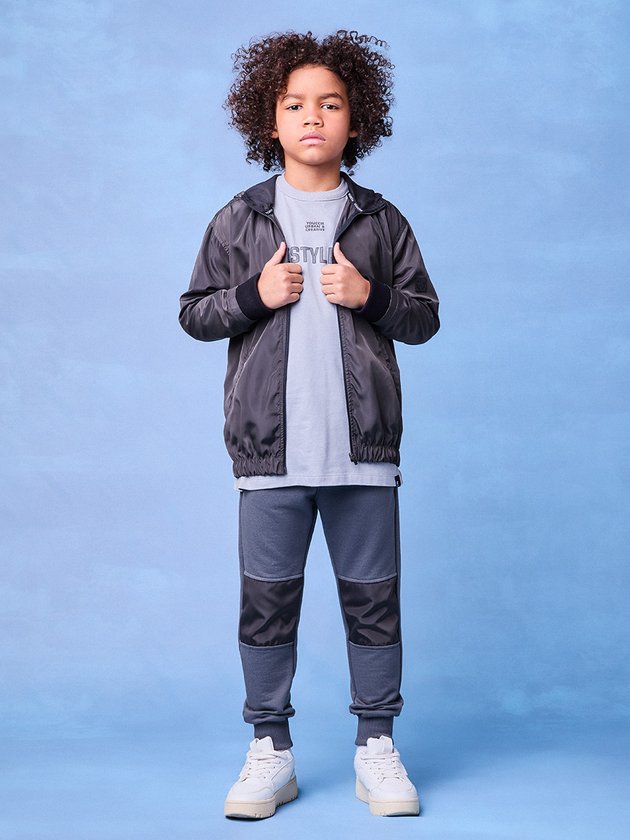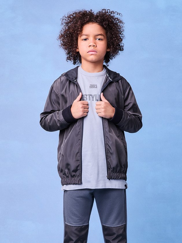 Elegância e funcionalidade se encontram nesta jaqueta preta com capuz da Youccie. O tecido brilhante adiciona um toque moderno ao design esportivo, enquanto os detalhes ajustados na barra e punhos proporcionam conforto e proteção contra o frio. O zíper frontal torna fácil de vestir e a estética urbana eleva o visual de meninos estilosos.