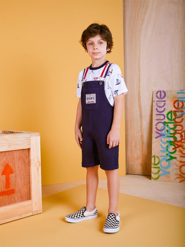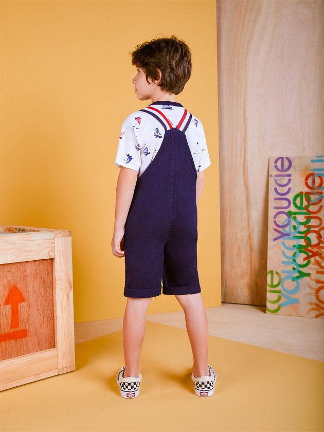 A jardineira marinho Youccie é uma peça moderna que compõe diversos looks para um verão ainda mais moderno. Confeccionada em sarja com modelagem básica ela traz em seus detalhes alças contrastantes, fechamento no ombro com fivela, regulagem e etiqueta decorativa no bolso. As combinações com essa peça podem ser feitas com camisetas de manga curta ou longa. Composição: 99% algodão e 1% elastano. Ref.: I0755