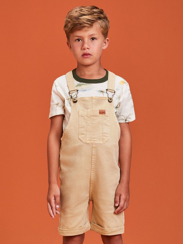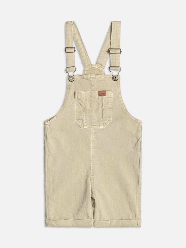 Jardineira infantil Youccie em jeans bege, com fivela e regulador para ajuste. Possui bolsos na frente e uma etiqueta decorativa nas costas. Pode ser usada com camisetas e casacos, criando um outfit cool e estiloso para os pequenos. Composição: 98% algodão e 2% elastano. Ref.: I1144