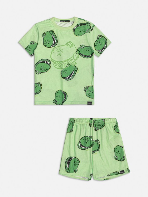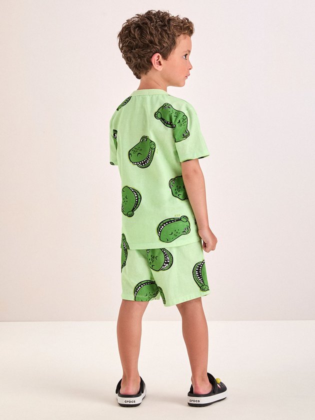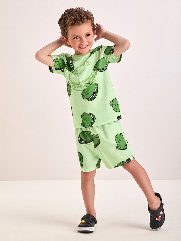 Entre no clima jurássico com o Conjunto Dino Fun! Com uma camiseta e shorts verde lima repletos de dinossauros, este conjunto é a escolha ideal para os pequenos que amam diversão e estilo. Perfeito para dias de pura brincadeira!