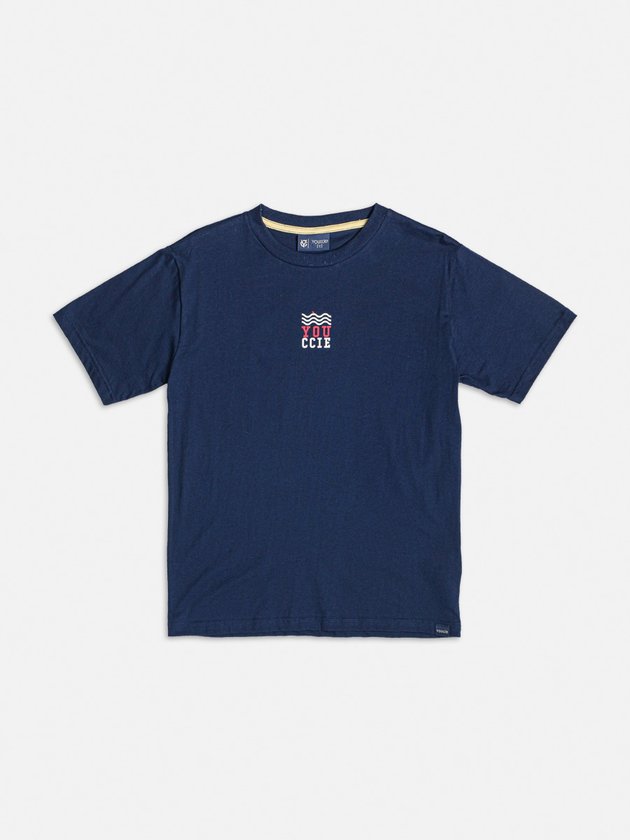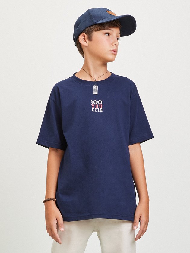 Camiseta azul marinho Youccie, com estampa frente e costas, e gola em ribana. Perfeita para o dia a dia, combina facilmente com calças e bermudas, proporcionando conforto e estilo para os meninos. Composição: 100% algodão. Ref.: D1861